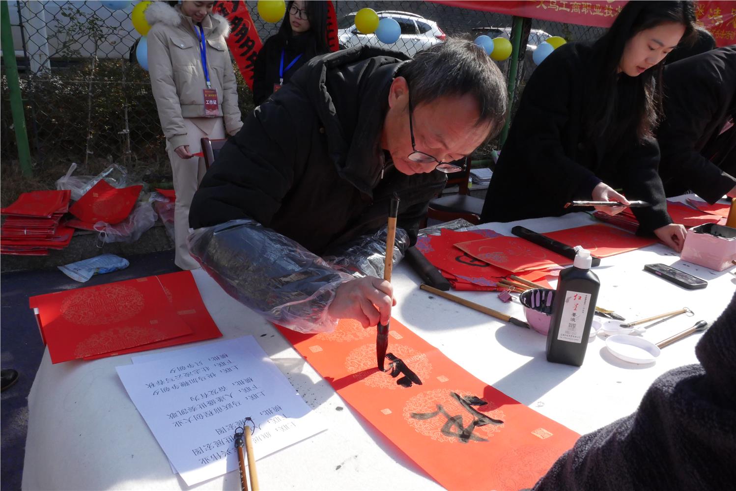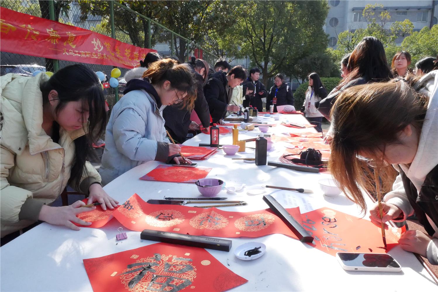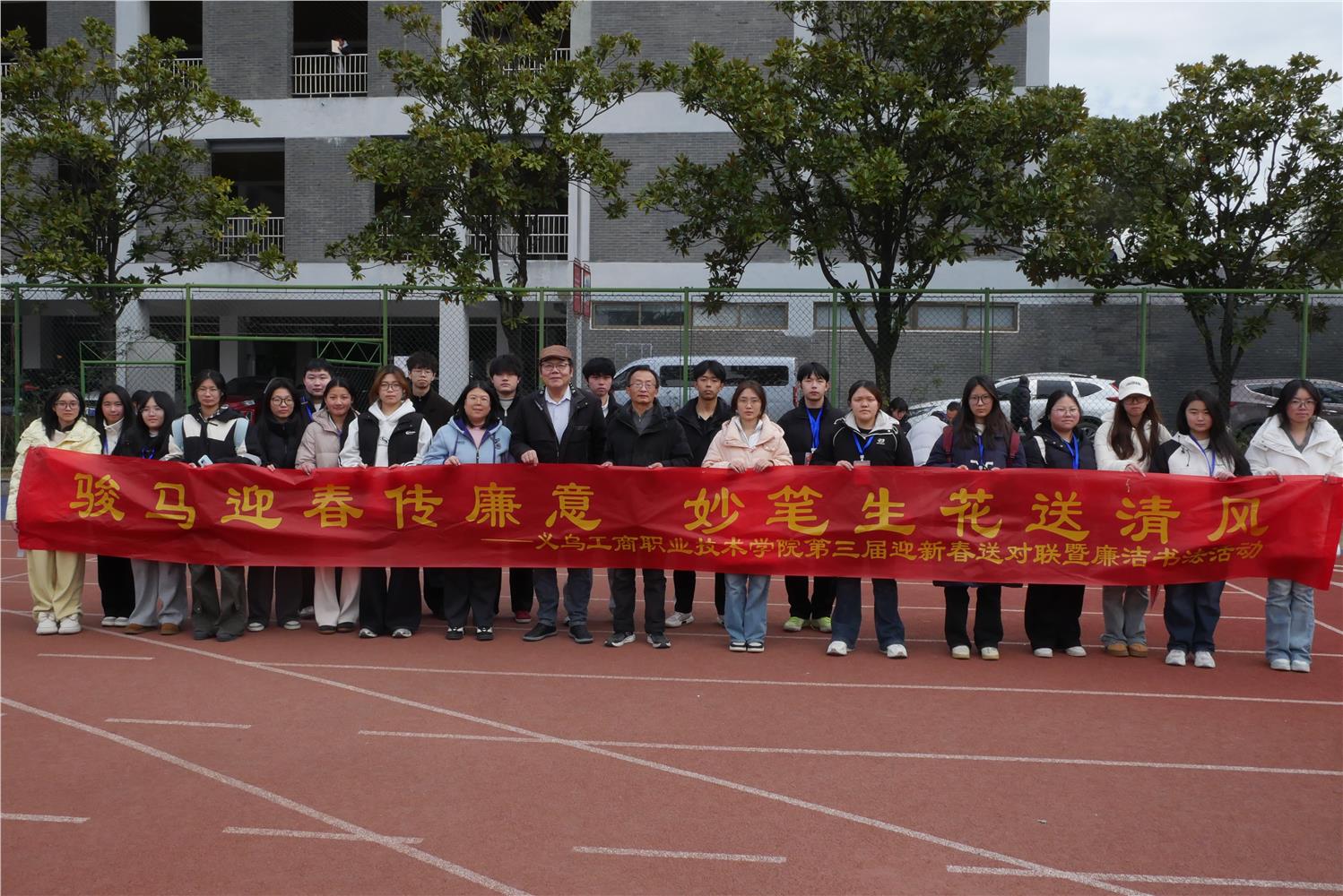 1月12日,义乌工商职业技术学院湖畔操场墨香四溢、笑语盈盈。在2026年马年新春即将来临之际,由校纪委办、校工会联合主办,人文旅游学院承办的“骏马迎春传廉意,妙笔生花送清风”新春廉洁书画活动在此温情举办。活动以书写春联为重点,将传统书法艺术与廉洁文化教育相结合,为广大师生送上诚挚的新春祝福,营造了风清气正、崇廉尚洁的校园文化氛围。