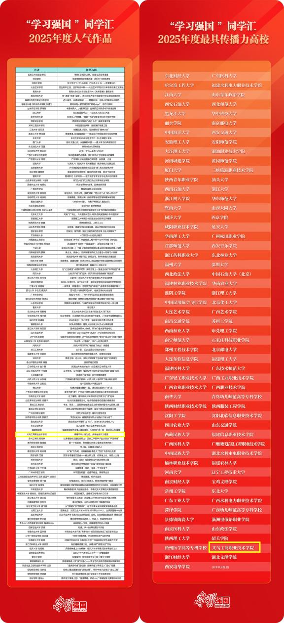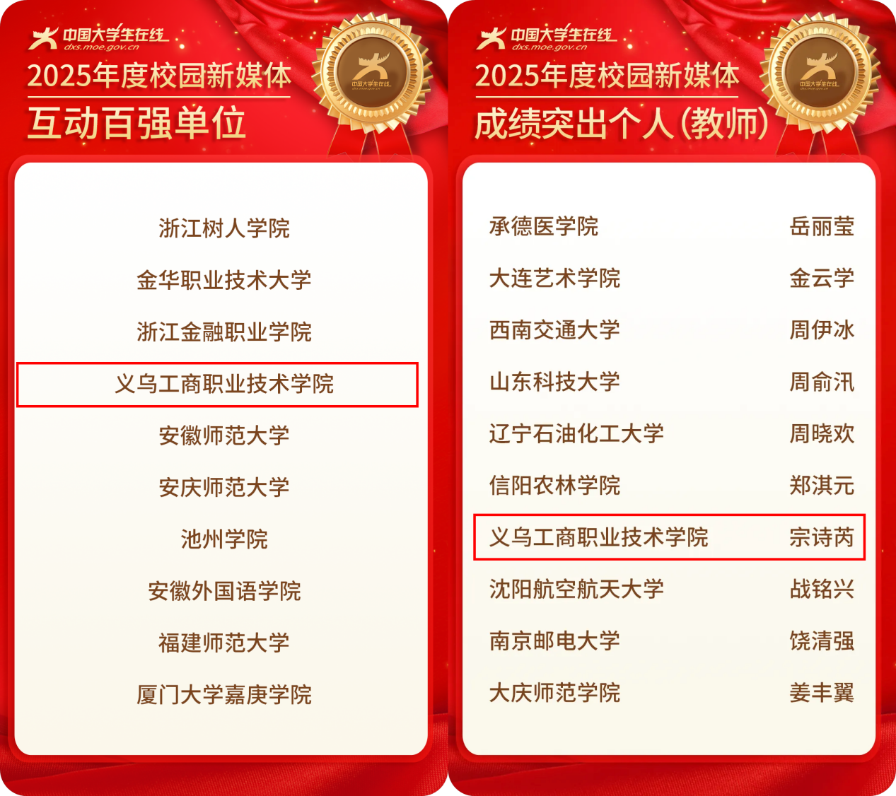 近日,“学习强国”同学汇2025年度评选结果揭晓,义乌工商职业技术学院获评“学习强国”同学汇“年度最具传播力高校”,《青春不以山海为远,戎装在身只为祖国》获评“学习强国”同学汇“年度高校人气作品”。在日前教育部中国大学生在线2025年度校园新媒体融合共建表彰名单中,义乌工商职业技术学院获评“年度校园新媒体互动百强单位”,宣传部宗诗芮老师获评“成绩突出个人(教师)”。