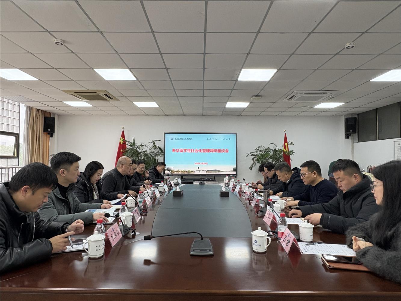 调研组一行对我校国际学生管理工作的系统性、针对性和实效性给予充分肯定和高度评价。随后,双方围绕国际学生社会化管理、创新创业支持体系、校地协同机制等工作议题,与我校展开深入研讨、交换意见建议,共同探索契合区域发展需求的国际化人才培养与管理新模式。