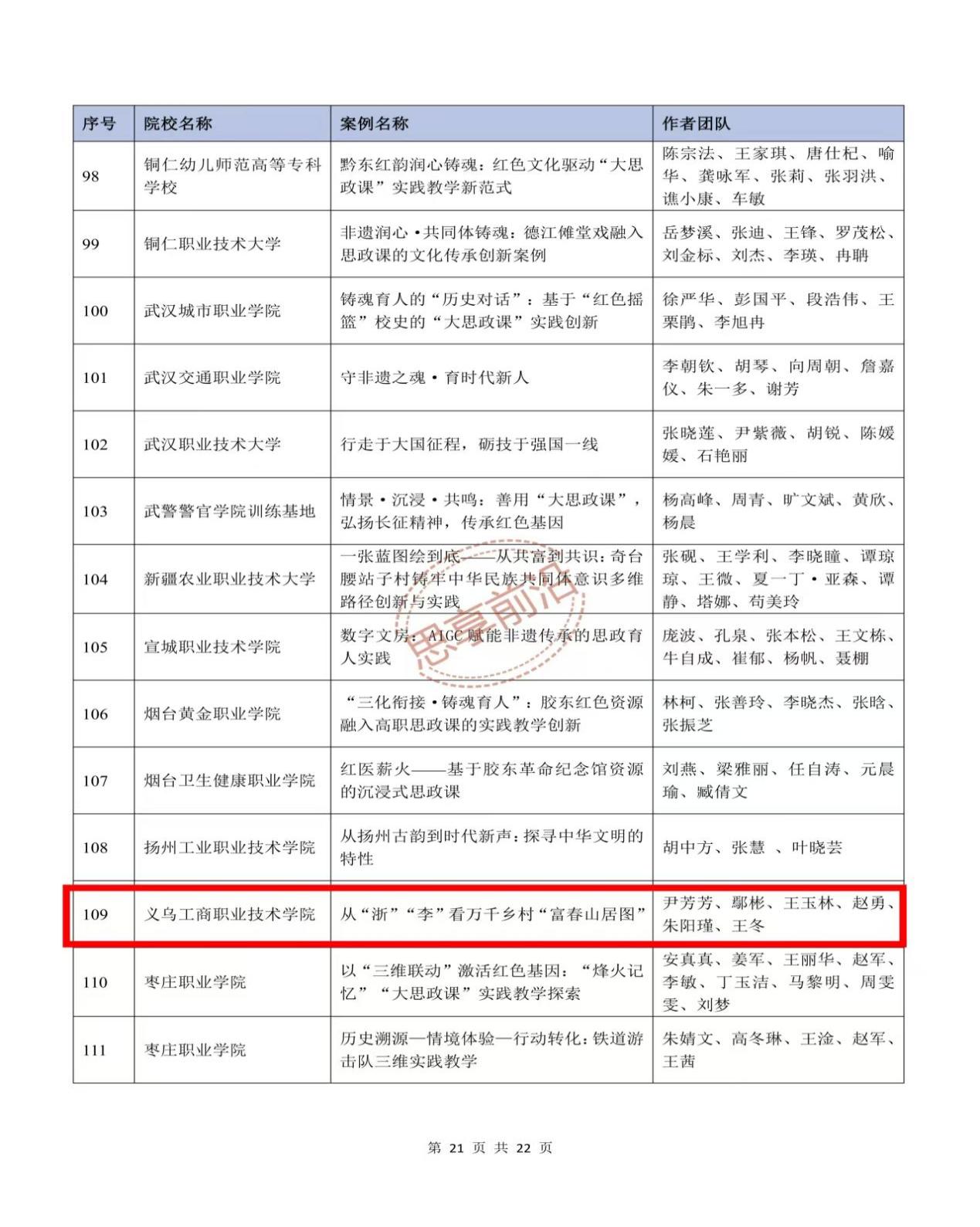 近日,由高等教育出版社与新华网联合举办的高校“大思政课”实践教学典型案例征集活动入选名单正式公布。经过层层遴选,全国共有292个案例最终入围,其中普通本科教育组171个,职业教育组121个。我校马克思主义学院尹芳芳团队(成员:鄢彬、王玉林、赵勇、朱阳瑾等)申报的实践教学案例《从“浙”“李”看万千乡村“富春山居图”》作为全省入选的两所高职院校之一,成功跻身全国“大思政课”实践教学典型案例。