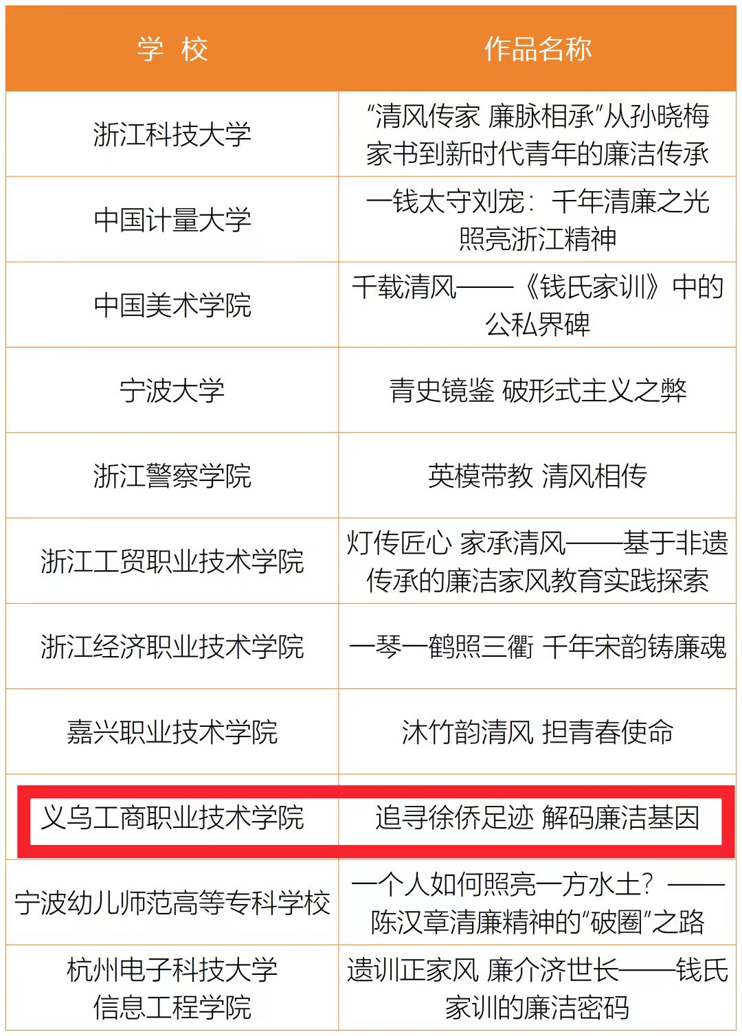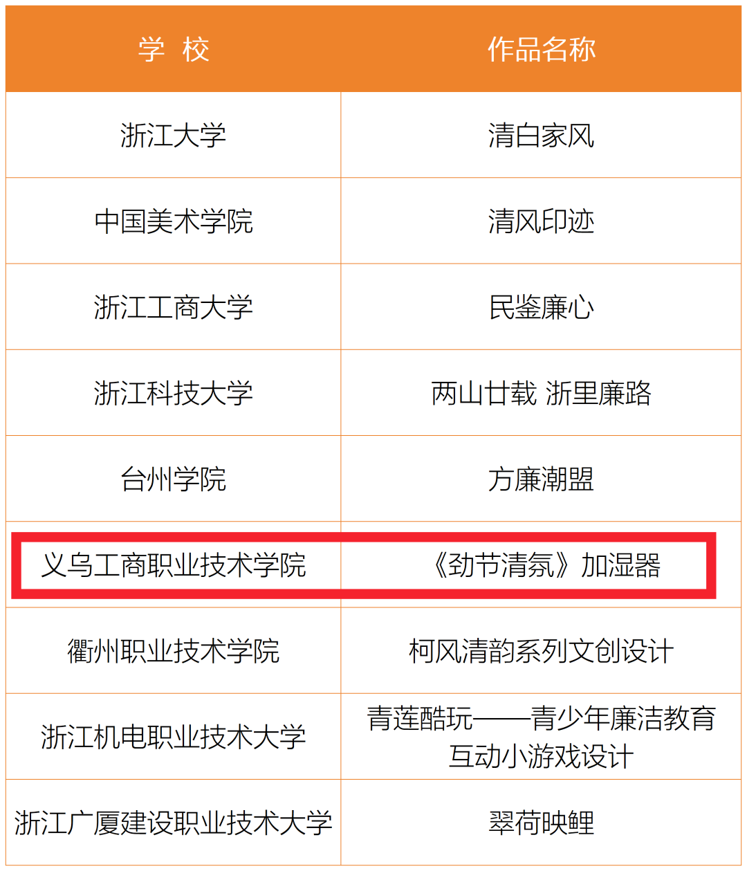近日,教育部公示第十届高校廉洁教育系列活动遴选结果,本次活动由教育部思想政治工作司主办,以“清风育德守初心 廉洁笃行担使命”为主题,覆盖全国全日制普通高校师生,旨在推动廉洁教育融入办学治校、教书育人全过程。浙江省40多所高校参与,入选优秀作品65件,竞争激烈、含金量高,我校选送的2件作品成功入选,获奖数量位居全省高校前列,实现了在该领域的历史性突破。其中,《劲节清氛》加湿器获评“绘廉铸魂”创意优秀作品,《追寻徐侨足迹 解码廉洁基因》获评“青廉说”廉洁微网课优秀作品。