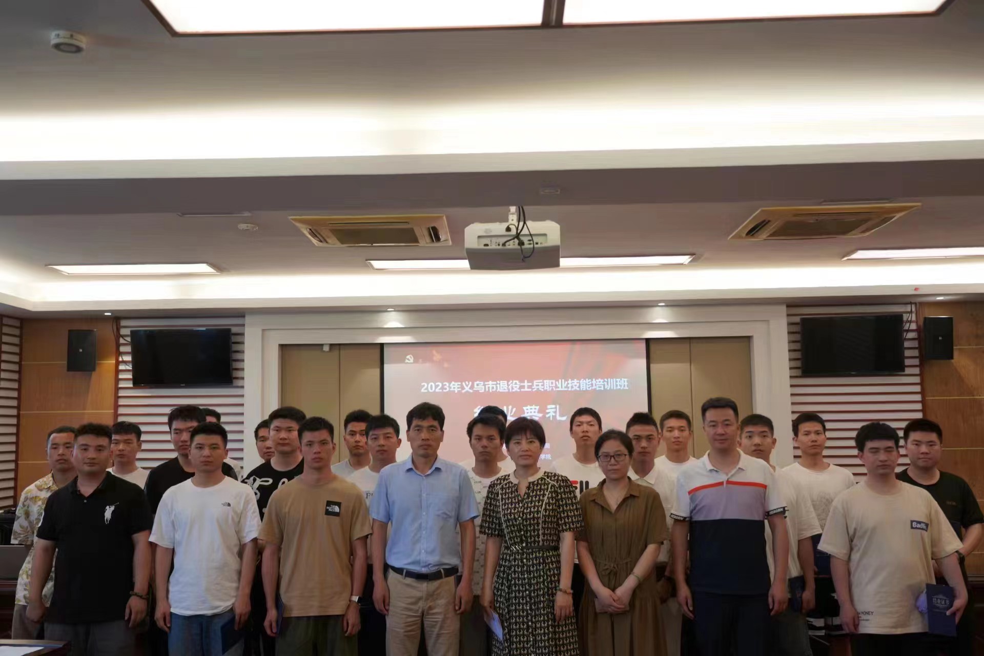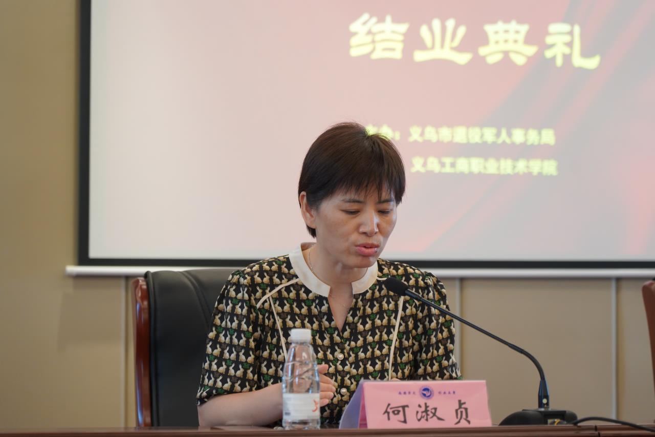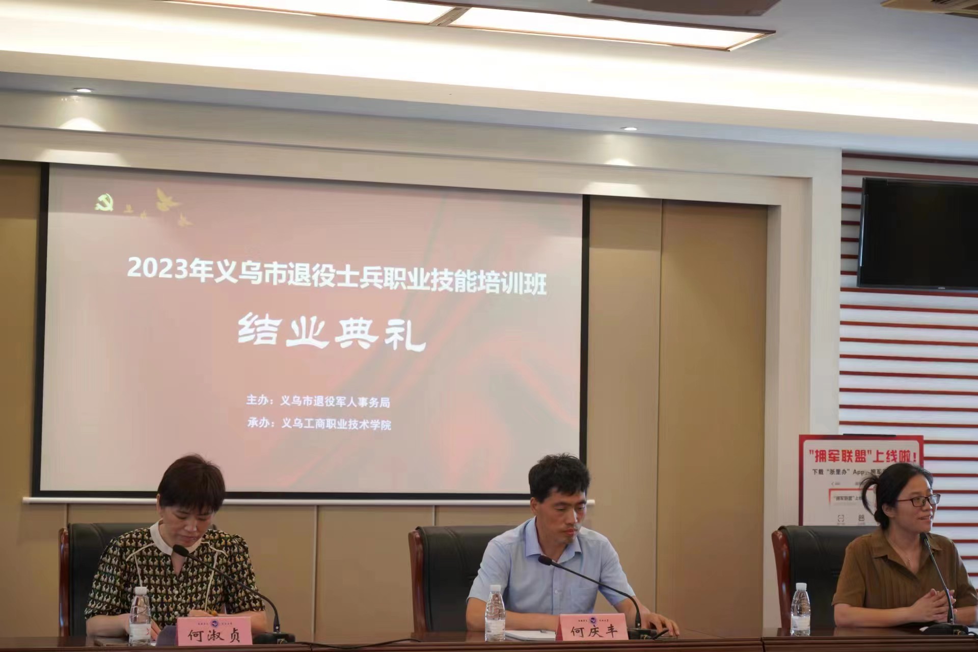 5月31日下午,2023年义乌市退役士兵职业技能培训在义乌工商职业技术学院智慧厅举行结业典礼。义乌市退役军人事务局副局长何庆丰,义乌工商职业技术学院马克思主义学院(公共基础学院)院长、党委副书记何淑贞等参加典礼。