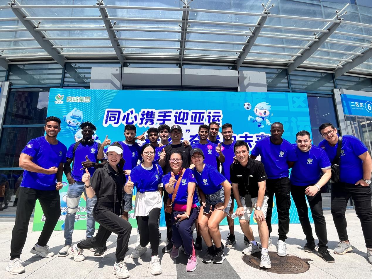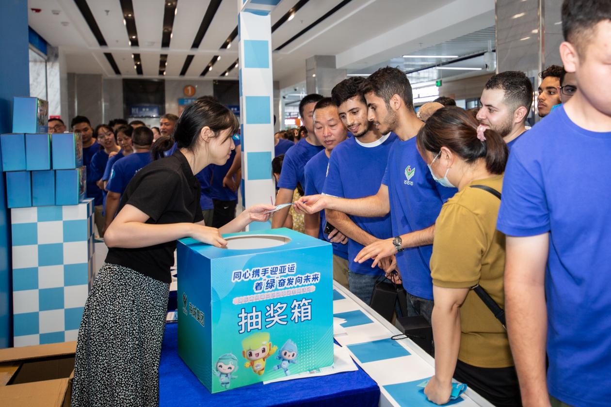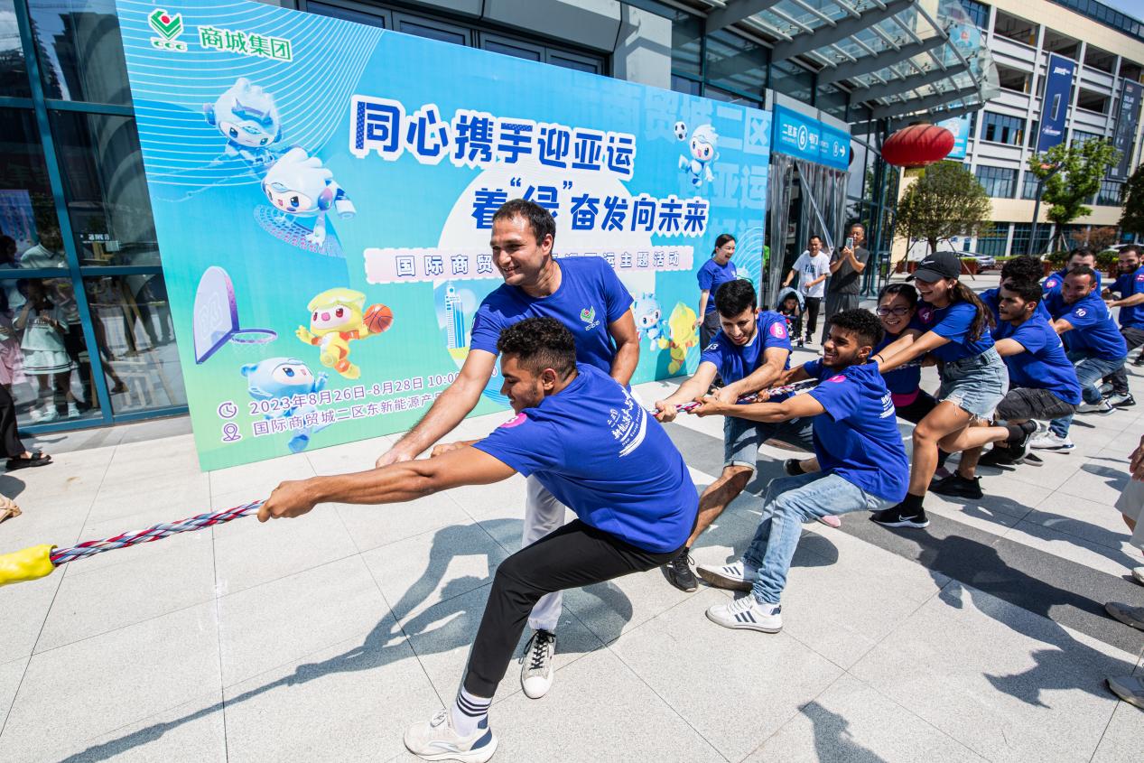 8月26日,一场以“同心携手迎亚运,着‘绿’奋发向未来”为主题的趣味运动会在国际商贸城二区新能源市场举行。国际教育学院来自俄罗斯、哥伦比亚、埃及、约旦、也门、叙利亚等国家的15名国际学生前往现场,体验火热的亚运氛围。