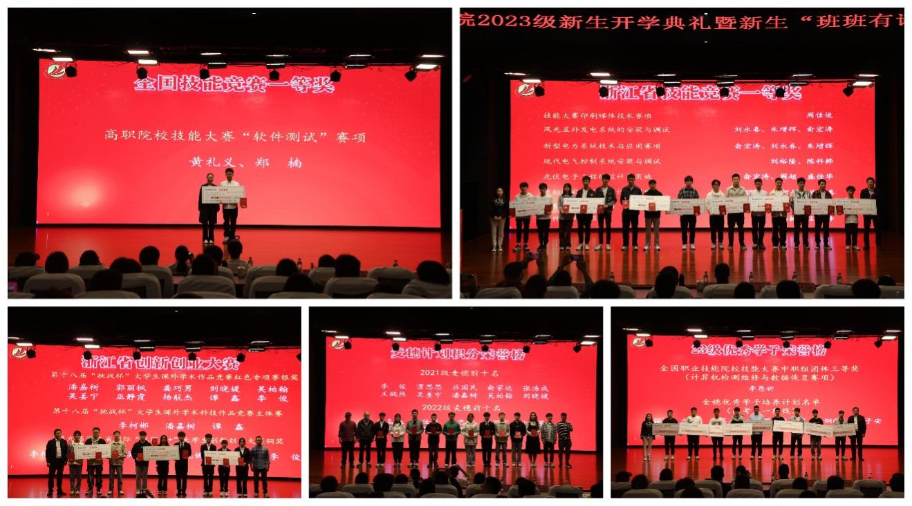 典礼上,学院相关负责人宣读表彰文件。学院对在2022-2023学年职业院校技能大赛国赛、省赛和创新创业大赛、麦穗计划积分前十名及新生“金穗学子”培养计划对象等方面脱颖而出的优秀学子进行了表彰,并授予他们“红匠先锋”荣誉称号。学院领导班子成员、专业主任、三办主任依次上台为“红匠先锋”们颁奖。