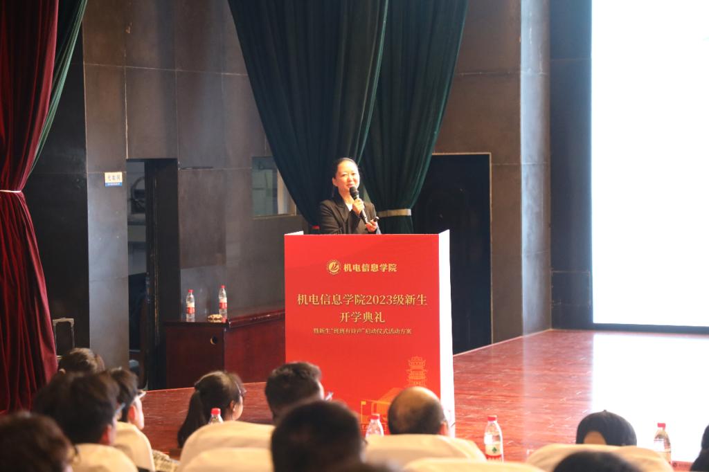 学院负责人以“青春有你匠心梦,乘风破浪机电人”为题为新生们“说学院”。她从学院的学习环境、师资团队、成长平台和政策保障四个方面全方位介绍了新生们未来三年可以享受的来自学院的“成长定制套餐”。她鼓励大家在大学期间利用好实训环境、师资力量以及团委、学生会、工作室和创新创业孵化基地等平台,提升自我,不负青春韶华。
