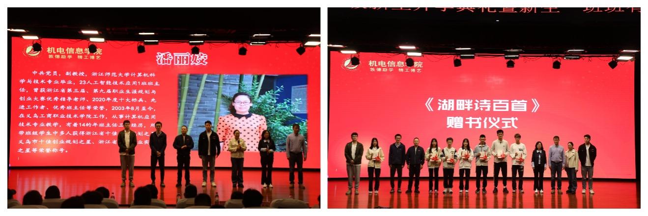 最后,校友代表和新生班主任代表为新同学们送上寄语,班主任为新生班级代表赠书《湖畔诗百首》,学生干部集体朗诵了《将近酒》,新生“班班有诗声”活动正式启动。