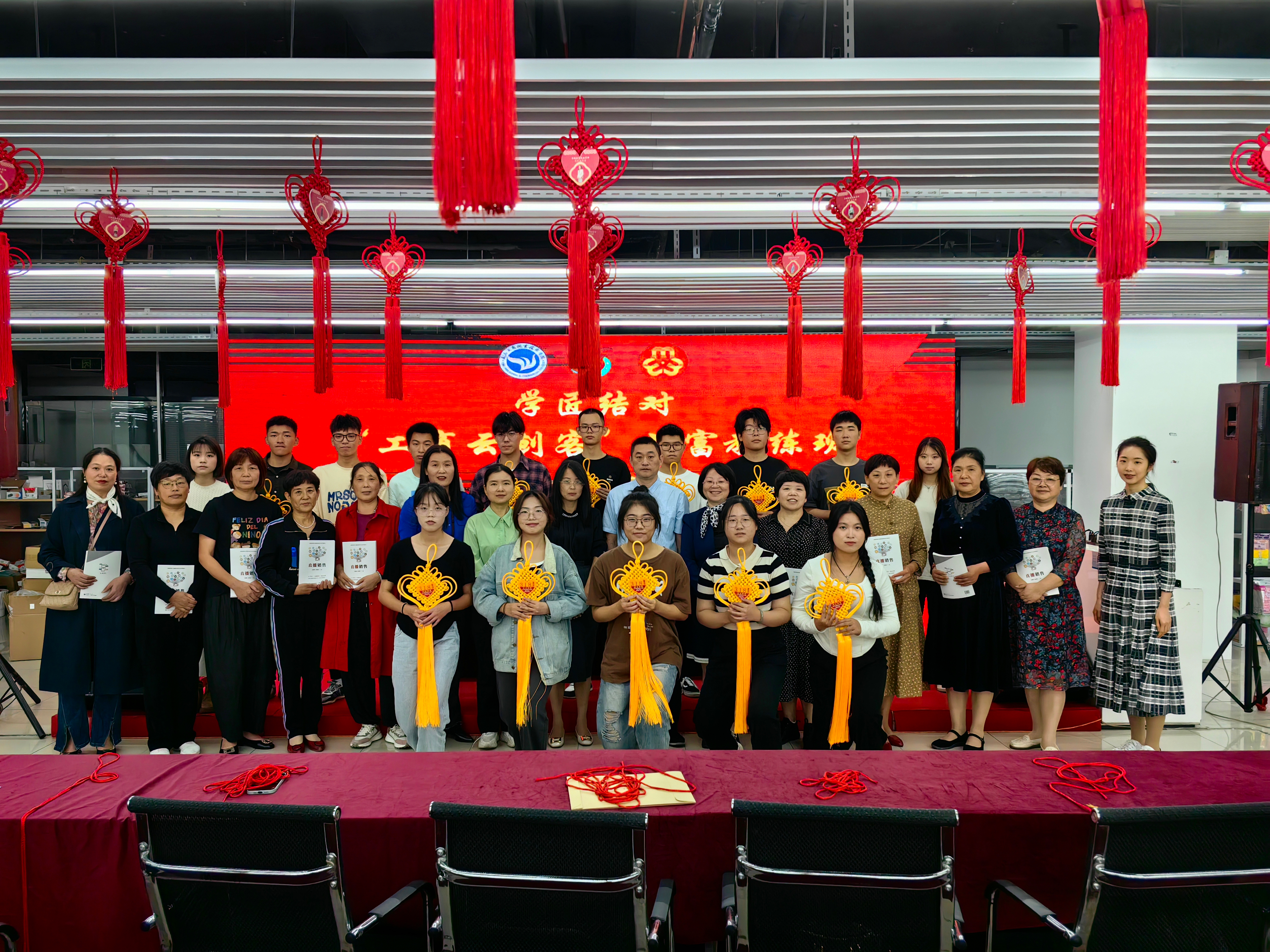 最后,义乌市巾帼帮帮团匠人与13位新生代表进行了结对仪式,青春洋溢的学员与慈爱亲切的匠人将中国结和直播教材进行了交换仪式,这是师傅与徒弟之间互学互助的承诺,更是年轻一代力量和老一辈匠人在共同富裕之路上使命的传承。