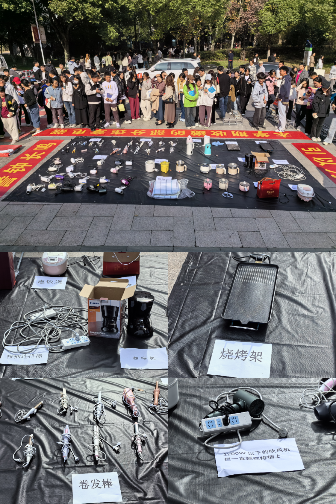 活动现场陈列了60余件违规电器,并将排插串联、吹风机违规使用等常见的违规行为也进行了展示。展览引得众多师生驻足,“原来这也属于违章使用电器”“竟然还有人在寝室做饭,这不应该啊”等讨论不绝于耳。工作人员通过现场答疑互动,介绍各类违禁物品的危害以及学校禁用违禁物品的原因,分析使用存在安全的隐患等等。同学们纷纷表示回去要破除侥幸心理,同时还要熟读学生手册,避免误用违章电器。