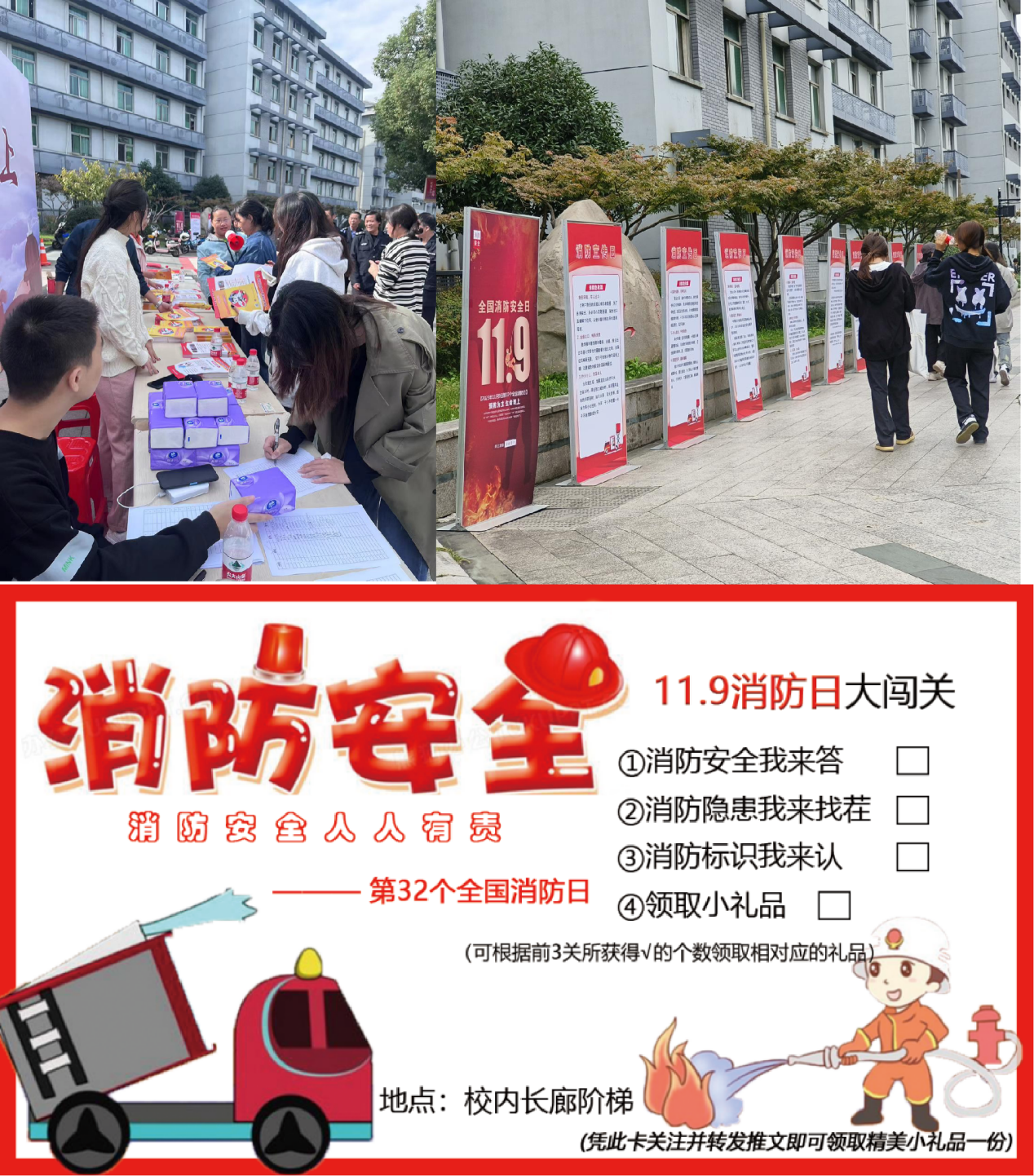 本次活动还设有消防安全知识喷绘展和趣味互动区,600余师生直接参与“消防安全我来答”“消防隐患我来查”“消防标识我来认”趣味活动,在轻松愉悦的氛围中不仅收获了消防安全纪念小奖品,更收获了宝贵的消防安全知识。