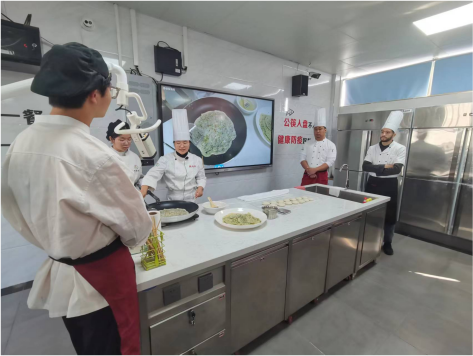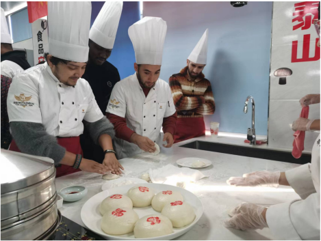 活动伊始,国际学生在“感知中国”何少庆名师工作室带领下参观了义乌城镇职校非遗技艺实训基地,进入该校烹饪实训楼面点实训室,在专业教师的指导下观看了省级非遗“东河肉饼”、市级非遗“吴店馒头”的历史文化背景及其制作过程。