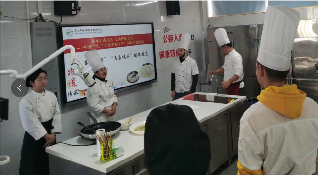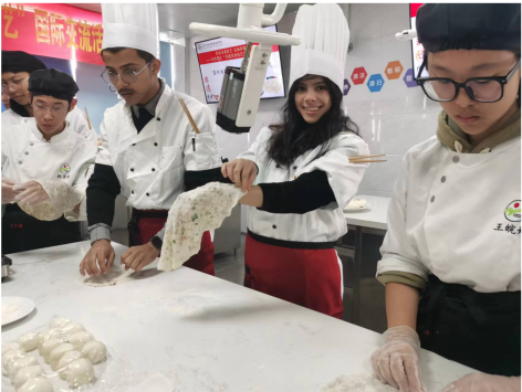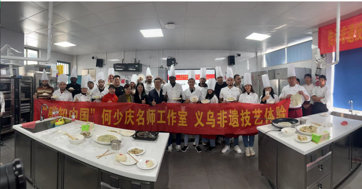 11月15日,国际教育学院来自土耳其、哥伦比亚、叙利亚、也门等国家的15名国际学生走进义乌市城镇职校,体验东河肉饼、吴店馒头等非遗技艺,进行中外美食文化交流。