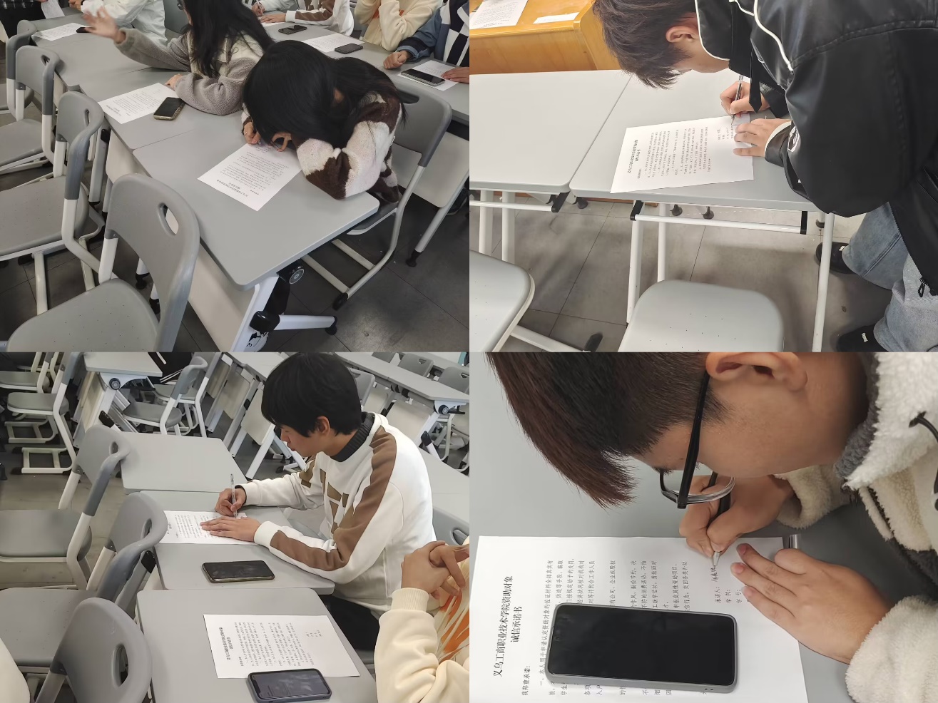 最后,组织新生资助对象签署了《义乌工商职业技术学院资助对象诚信承诺书》。同学们真诚地表达了对学校、学院资助工作的感谢,并就资助政策、学业规划及职业规划等进行了沟通交流。
