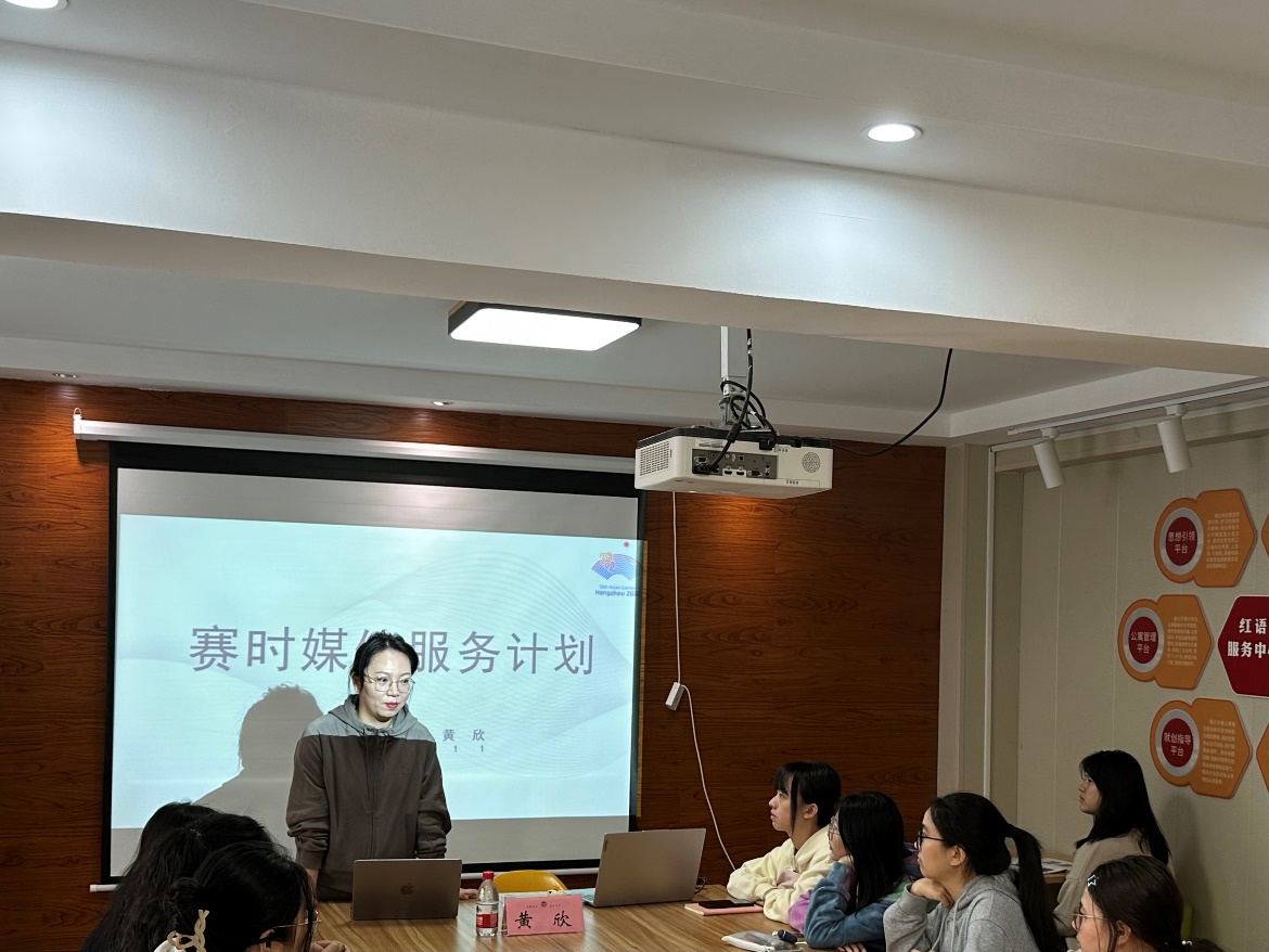 黄欣以手中别满胸针的工作证向同学们展示了其工作内容。在媒体运行团队中紧张答辩环节中,在高强度而又有条不紊的规范化、人性化、专业化业务知识和实战中,黄老师所在的团队及时为记者提供完备的工作设施和优质服务,从而帮助五湖四海的记者朋友更好地把“中国特色、亚洲风采、精彩纷呈”的体育文化盛会展示分享给全世界。