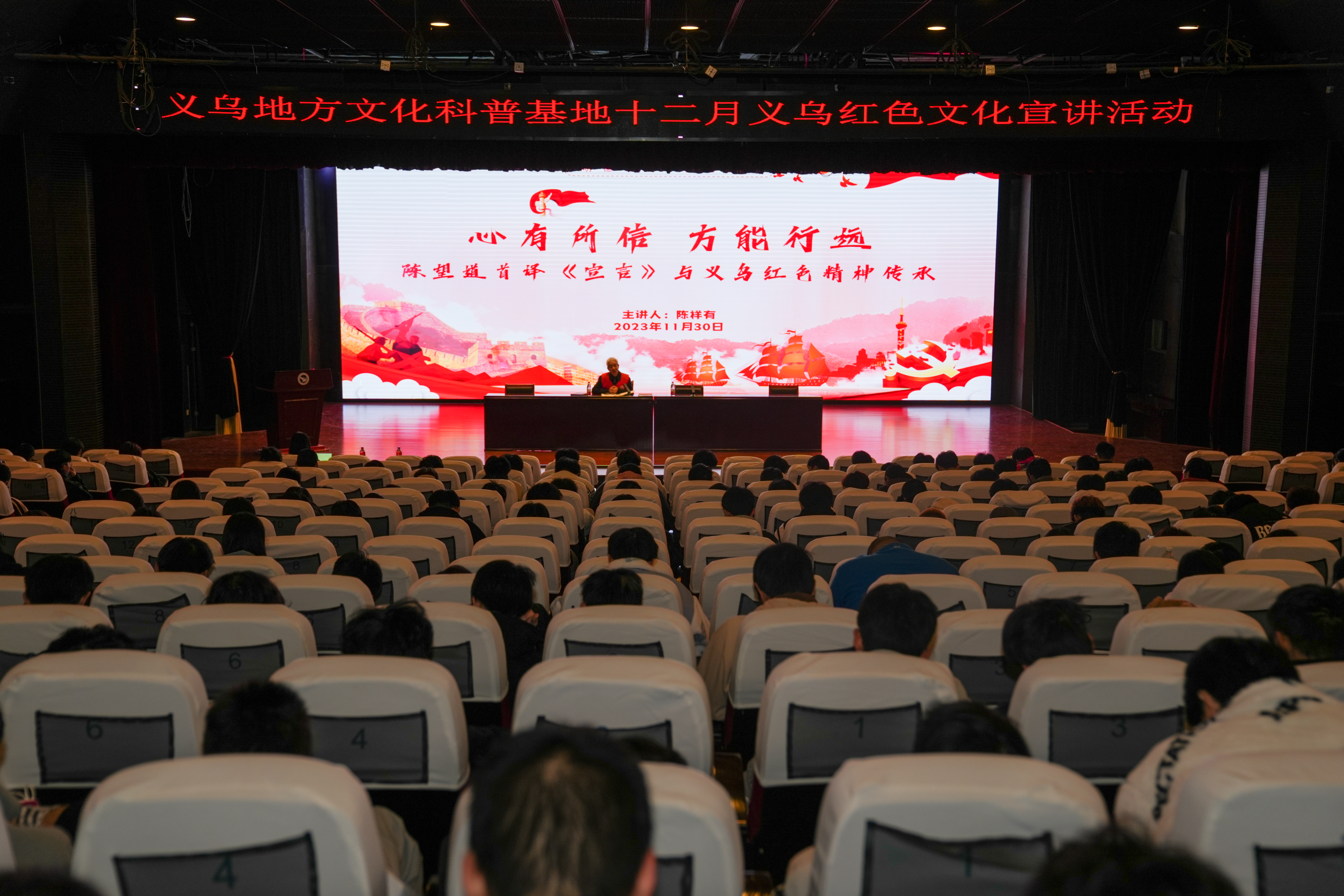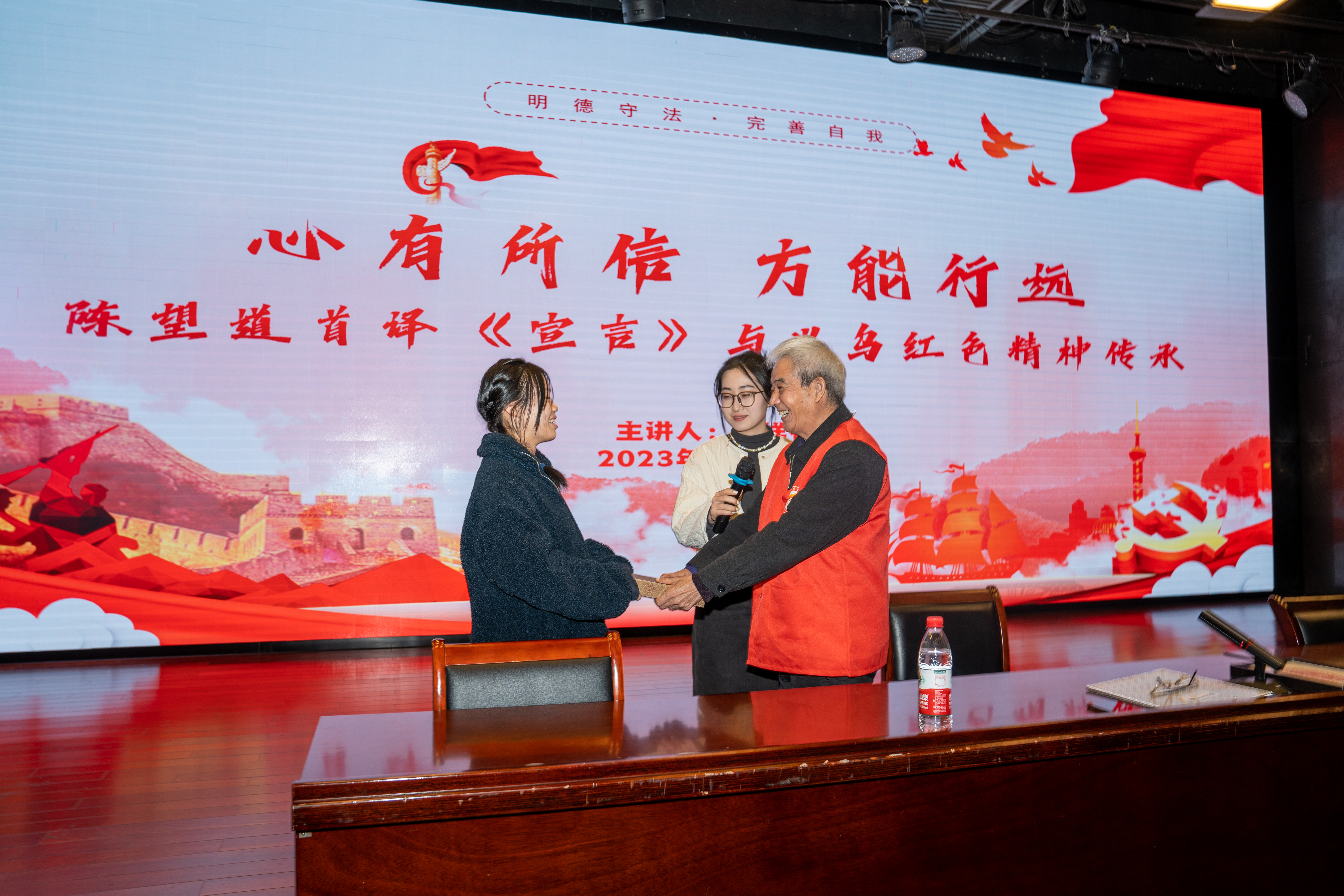 11月30日,马克思主义学院教师代表、建筑工程学院全体大二学生和党员师生代表齐聚丹溪文化厅,共上一堂大思政课,特邀陈祥有先生作《心有所信 方能行远——陈望道首译<宣言>与义乌红色精神传承》主题讲座。这次活动是义乌地方文化科普基地的特色活动之一,也是马克思主义学院和建筑工程学院联合开展思想政治教育和地方文化科普的具体实践。