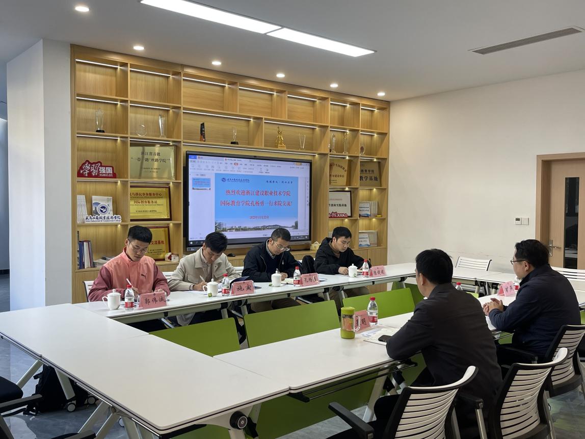 孔杨勇高度赞扬我校教育国际化工作实践和取得的成绩,介绍了浙江建设职业技术学院办学情况和教育国际化工作进展。随后,双方就国际学生招生、国际化师资队伍建设、特色办学、中外合作办学等方面内容进行了深入交流和探讨。双方期待进一步加强两校联系和合作,合力推进两校各项事业发展。