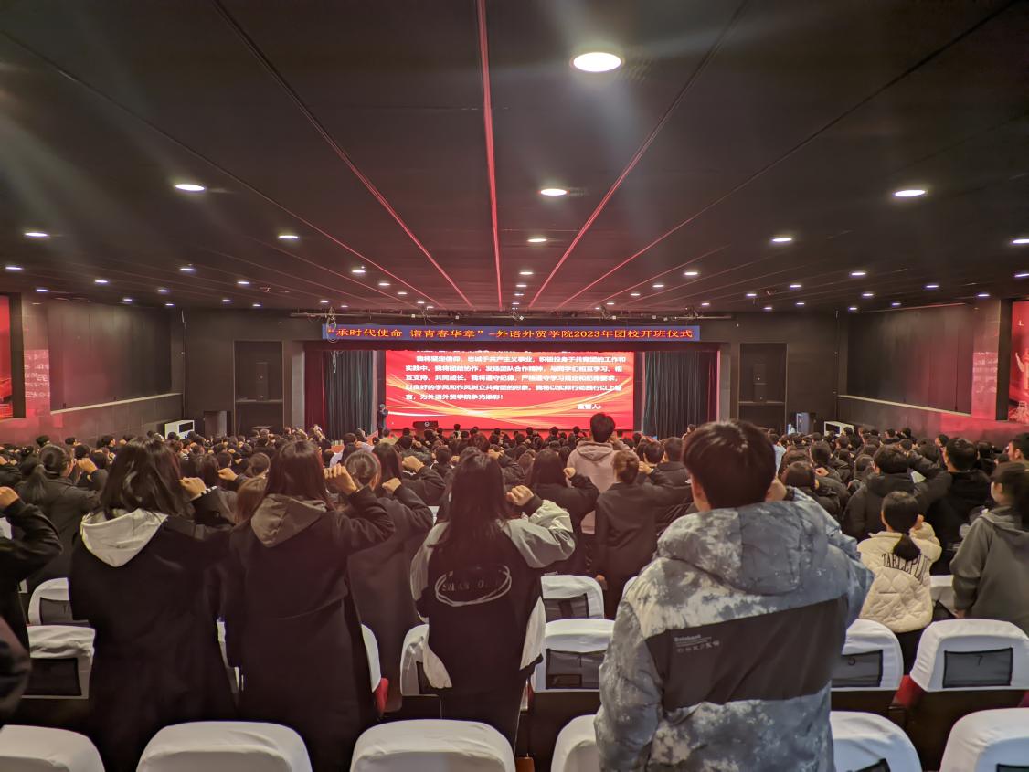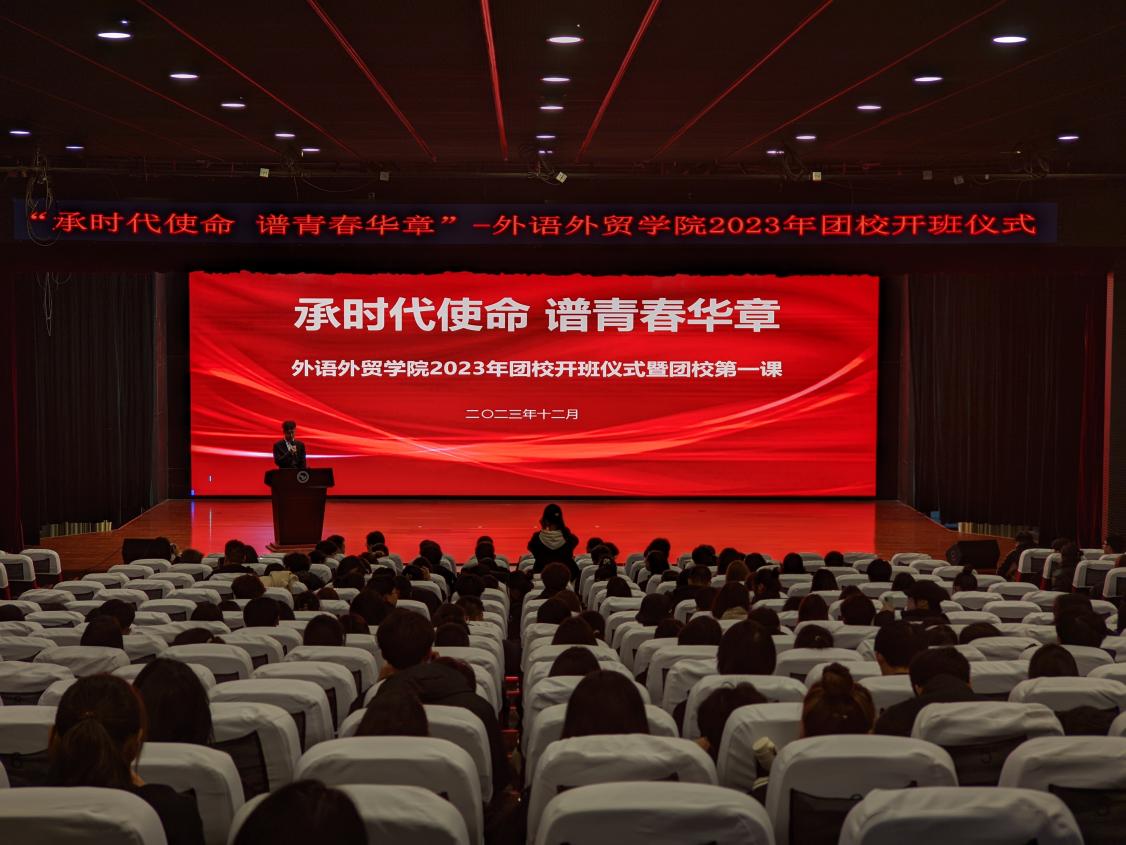 12月12日下午,外语外贸学院团校“青炬班”的开班仪式暨第一堂团课在丹溪文化厅顺利举行。外语外贸学院党委负责人、全体辅导员及“青炬班”学员近五百人出席参与了本次开班仪式。