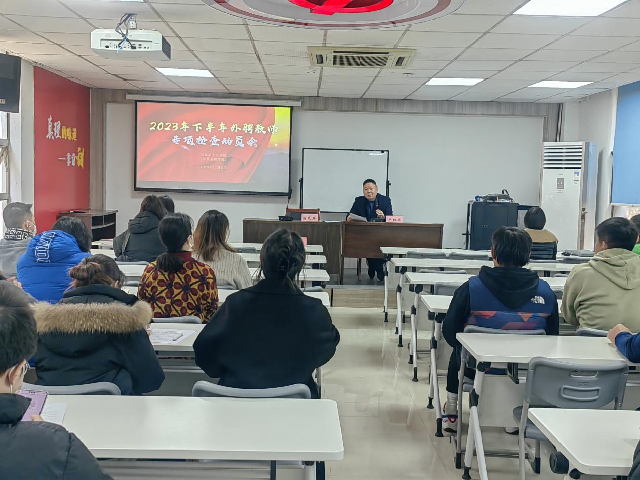 为进一步规范马克思主义学院(公共基础学院)外聘教师队伍管理,提升学院外聘教师教学效果和质量,马克思主义学院(公共基础学院)于2023年12月6日下午在大会议室召开了外聘教师专项检查培训活动。此次培训活动由马克思主义学院教学负责人卢红军主持,学院24名外聘教师参加。