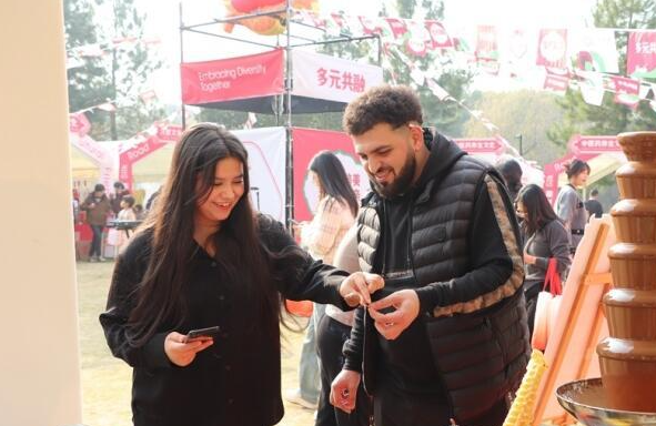 文化节上,国际学生们观看了丝路文艺展演,体验了丝路美食街、丝路文化圈等项目,同时沉浸式穿越“丝绸之路”,感受了文艺之美。为提高互动性和趣味性,此次文化节还特别设计了集章打卡环节,参与者通过集齐五福打卡的方式更深入了解各国文化,集齐五福可抽取一份好礼。投壶、射箭、蹴鞠,国际学生们在现场玩的不亦乐乎。来自叙利亚的国际学生阿奇兹,第一次感受中国传统体育项目,在开园半小时的时间里,已经收集了3个展位的印章。他表示,没想到文化节还能这么有趣,好吃好拍好逛又好玩。