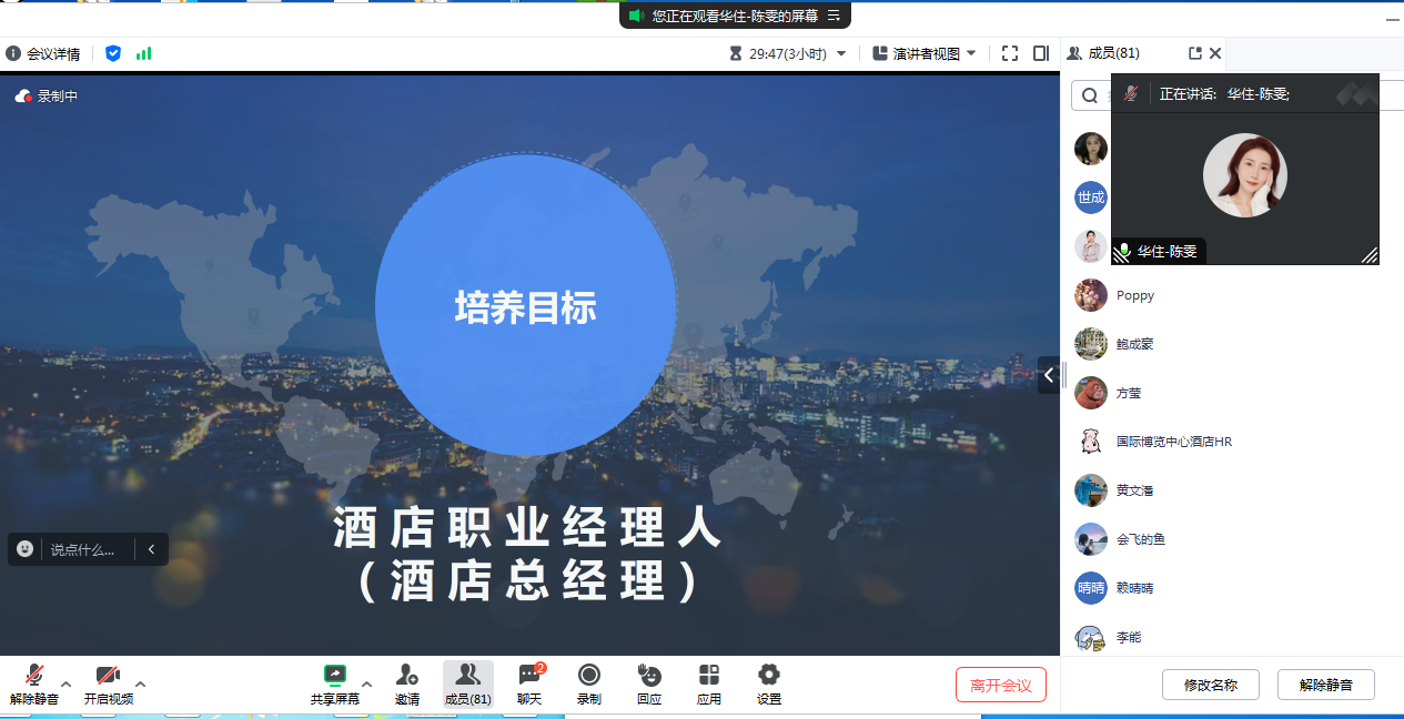 此次招聘会在腾讯会议上举行,参加招聘会的有杭州黄龙饭店、华住酒店管理有限公司、杭州开元森泊旅游投资有限公司等企业共计14家,提供就业岗位近200个。招聘岗位包括:总台接待、财务收银、宴会师、房务中心等。会上,招聘专员利用课件宣传介绍企业文化、工作环境、招聘需求、福利待遇等。同学们积极利用线上互动和招聘人员交流,了解企业和招聘岗位情况。