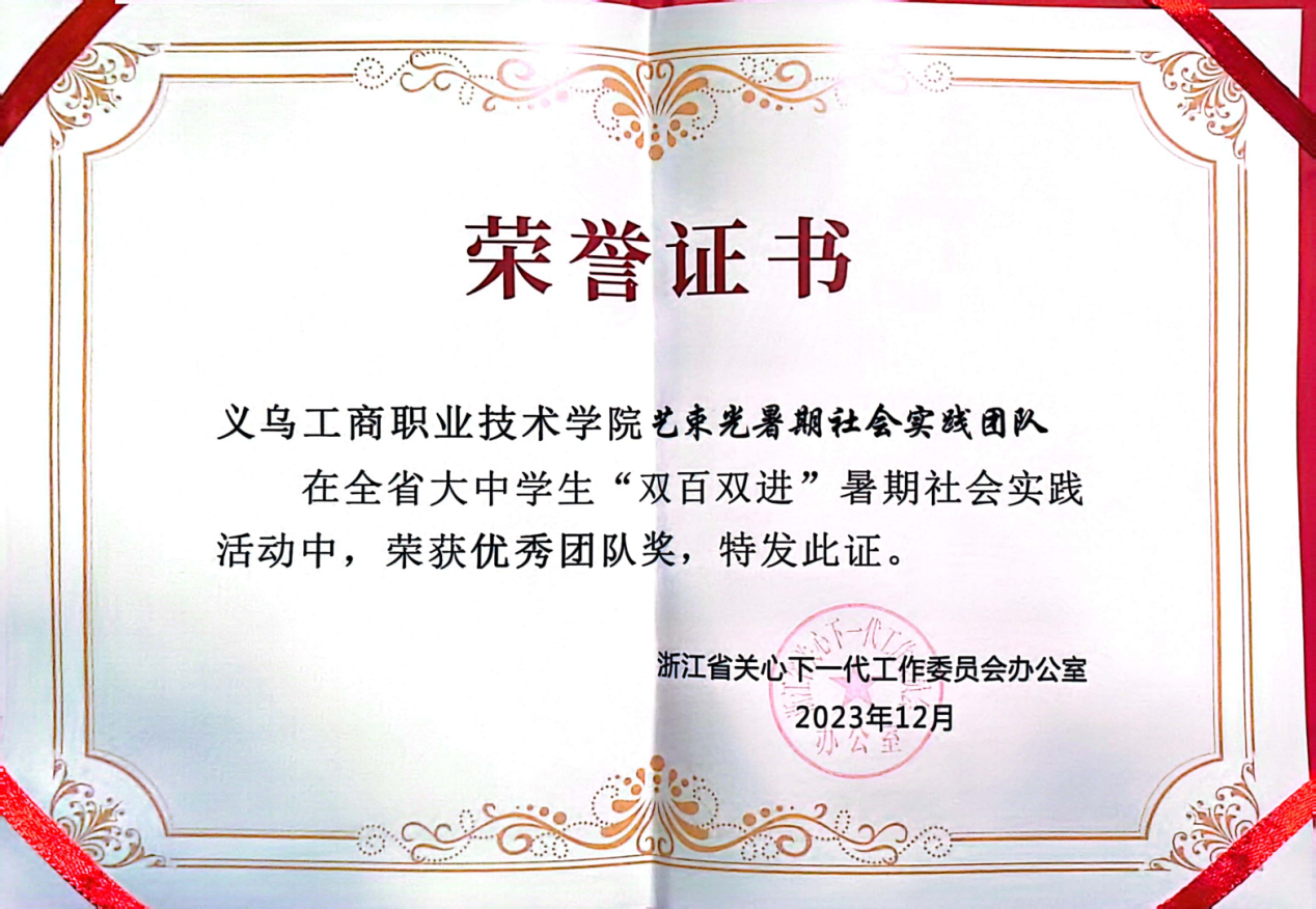 近日,浙江省关工委公布2023年全省大中学生暑期大学生实践团优秀团队评选结果,我校“艺束光艺术课堂暑期社会实践团队”获优秀团队荣誉。