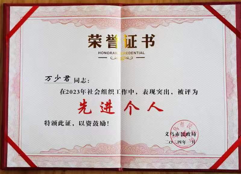 1月16日,义乌市民政局通报表彰了2023年度先进社会组织和先进个人,我校教师万少君荣获2023年度先进个人。