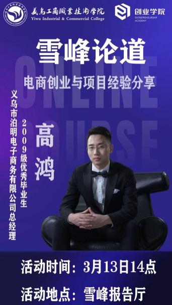 3月13日下午,创业学院邀请义乌市泊明儿童用品有限公司总经理高鸿在雪峰报告厅为创业学子开展了“雪峰论道”系列讲座——电商创业项目经验分享暨2024年创业学院“315”专题讲座。
