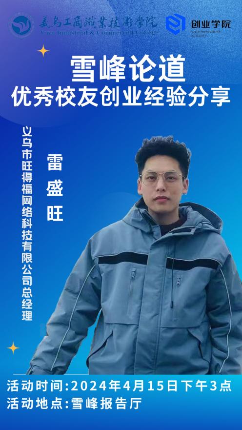 4月15日下午,创业学院邀请了义乌市旺得福网络科技有限公司总经理、13e创电商2班优秀毕业生“雷锋哥”雷盛旺,于雪峰报告厅开展了主题为“创业经验分享”的“雪峰论道”系列讲座。