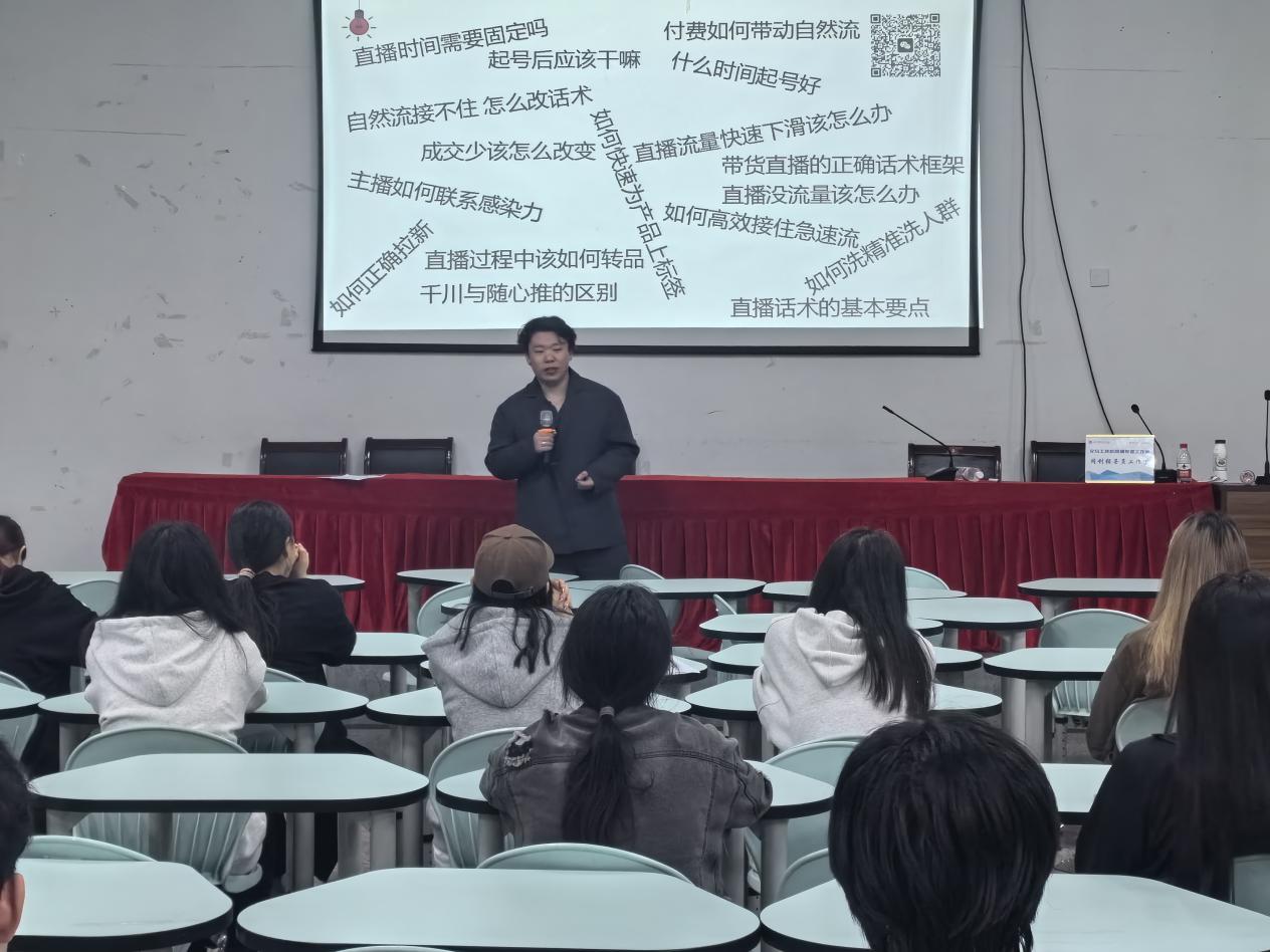 宣讲会伊始,凡子鹏介绍了他在校期间担任学院学生会主席、毕业后创业又就业、再投身创业的曲折经历,分享了不懈追求的创业梦想。随后,他通过提问,大家目前的创业状态如何、直播电商行业发展有何看法、直播电商创业机会有多大等问题,进行互动,旨在了解学弟学妹们当前的创业状态及对直播电商的看法。