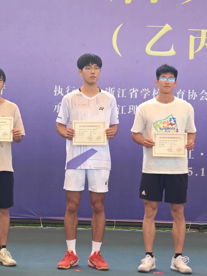 近日,由浙江省教育厅、浙江省体育局主办,浙江大学、浙江理工大学承办的浙江省第十四届大学生网球锦标赛(乙丙组)于5月11日-16日在永康市文体中心举行。本次比赛全省共有36所高校参赛,我校由机电信息学院郑立业、吴登俊、钱泽凯,建筑工程学院毛攀涛、申屠鸿鸣五位同学组成的运动队获得男子团体第五名;吴登俊同学荣获男子单打第六名;李诗雨、申屠鸿鸣两位同学荣获“优秀运动员”称号。
