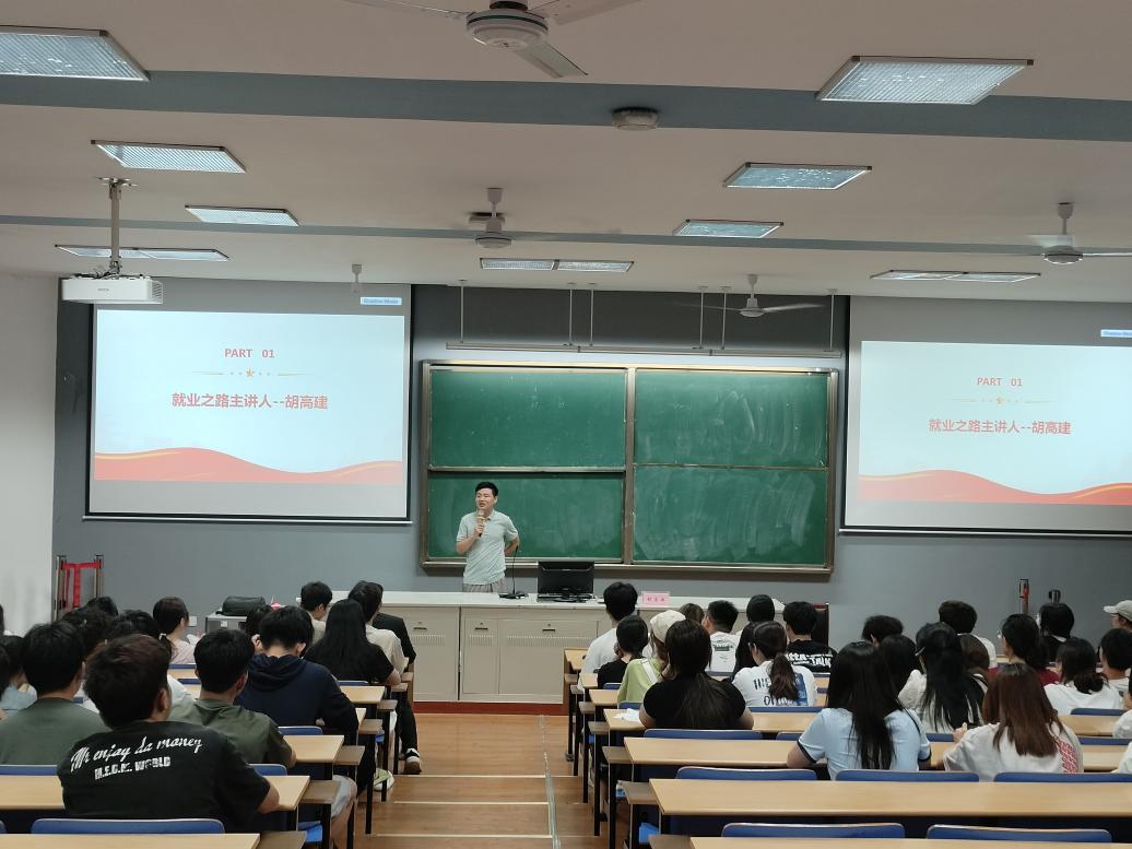 分享会在一片热烈的掌声中拉开帷幕。2016届优秀校友胡高建就个人学习、入伍、就业的成长经历进行了热情洋溢的分享。胡高建为在场学子解读了当前电商行业就业形势及行业热点概况,通过实例帮助同学们开拓了就业视野。