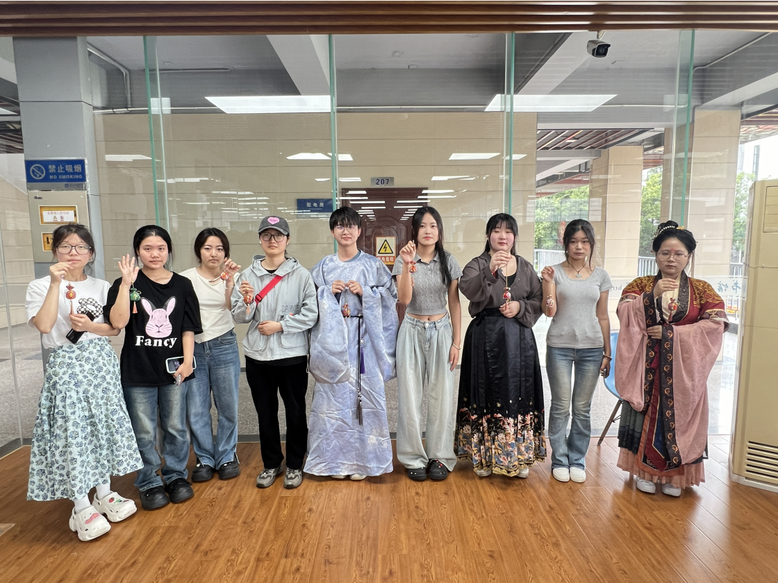 香囊又称香包、香袋,其制作和佩戴史至少可以上溯到战国时期,也是大家熟知的国家级非物质文化遗产。香囊里通常填充一些芳香开窍的中草药,有清香、驱虫、避瘟、防病的功能;佩戴香囊和吃粽子、赛龙舟一样,也是端午佳节的传统习俗之一。活动现场艾草飘香,一个个精致玲珑的香囊被师生巧手制作成型,煞是可爱。