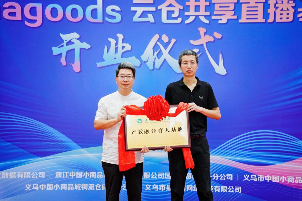 随后,在热烈的掌声中,学校和商城集团大数据公司的代表共同为Chinagoods云仓直播基地进行“产教融合育人基地”授牌。这一举措标志着双方合作迈入新的阶段,也象征着义乌直播电商行业在产教融合领域取得了新的进展。