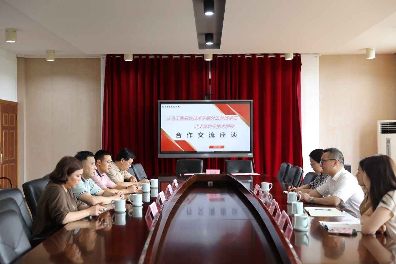 6月27日,义乌工商职院外语外贸学院党委负责人一行前往武义县职业技术学校,就双方党建联建共促专业建设、招生宣传等事宜进行深入交流。