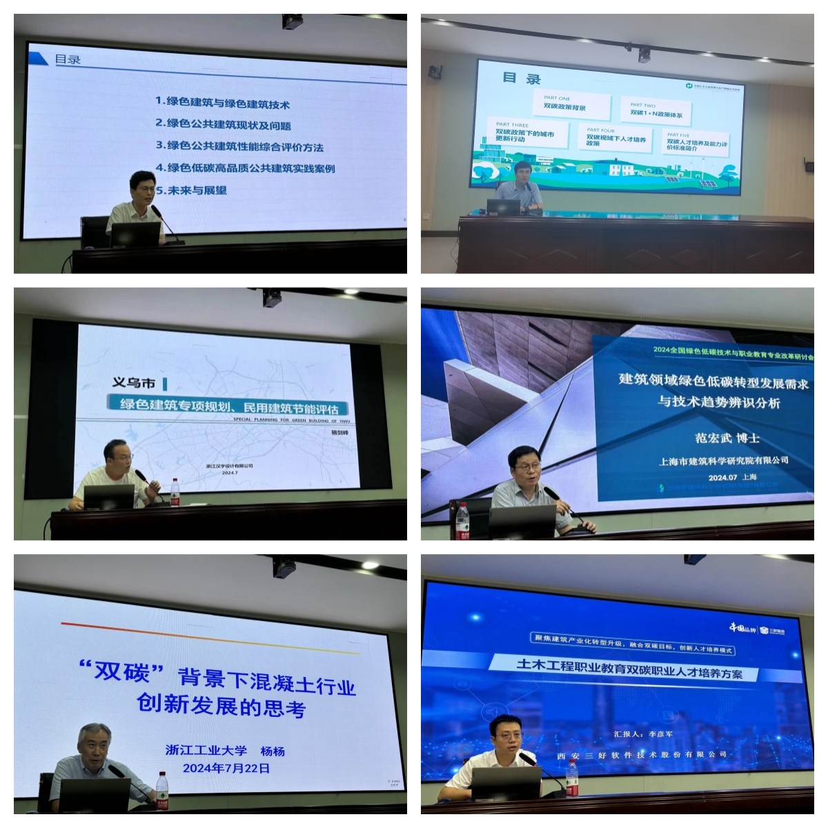 接下来是专题汇报环节。浙大城市学院讲师翁建涛博士以《浙江省绿色低碳高品质建筑的探索与实践》为题,分享了浙江省在绿色低碳建筑领域的成功案例和宝贵经验。全国土木工程双碳行业产教融合共同体理事长、三好股份董事长张巍则带来了《土建施工、路桥工程双碳人才职教培养指南及评价标准》,为行业人才培养提供了重要参考。浙江汉宇设计公司建筑院院长骆剑峰围绕《义乌绿色建筑专项规划及民用建筑节能评估介绍》,详细介绍了义乌市在绿色建筑规划及节能评估方面的创新举措和实践成果。全国建筑节能标准化技术委员会副主任范宏武的《建筑领域绿色低碳转型发展需求与技术趋势辨识分析》报告,则为参会者揭示了建筑领域绿色低碳转型的广阔前景和技术趋势。浙江工业大学教授杨杨在《双碳背景下混凝土行业创新发展的思考》的报告中,深入剖析了混凝土行业在双碳目标下面临的挑战和机遇,并提出了创新发展的策略建议。三好股份双碳教学事业部产品经理李彦军则通过《土木工程职业教育双碳职业人才培养方案》,展示了公司在职业教育领域对双碳人才培养的深入思考和积极探索。