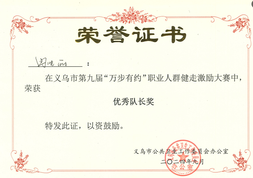 为了提高国民的身体素质,中国疾病预防控制中心举办了一项为期100天的健康运动项目——“万步有约”。大赛创新应用“互联网+健康”理念,发动社会各界参与,依托“团队”监督激励作用,帮助市民养成“日行万步,科学健走”的健康生活习惯。在此次活动中,我校荣获义乌市“金牌健走单位奖”,参赛团队队长冉晓丽获得“优秀队长奖”,完美地诠释了运动的独特魅力,合作的可贵精神。