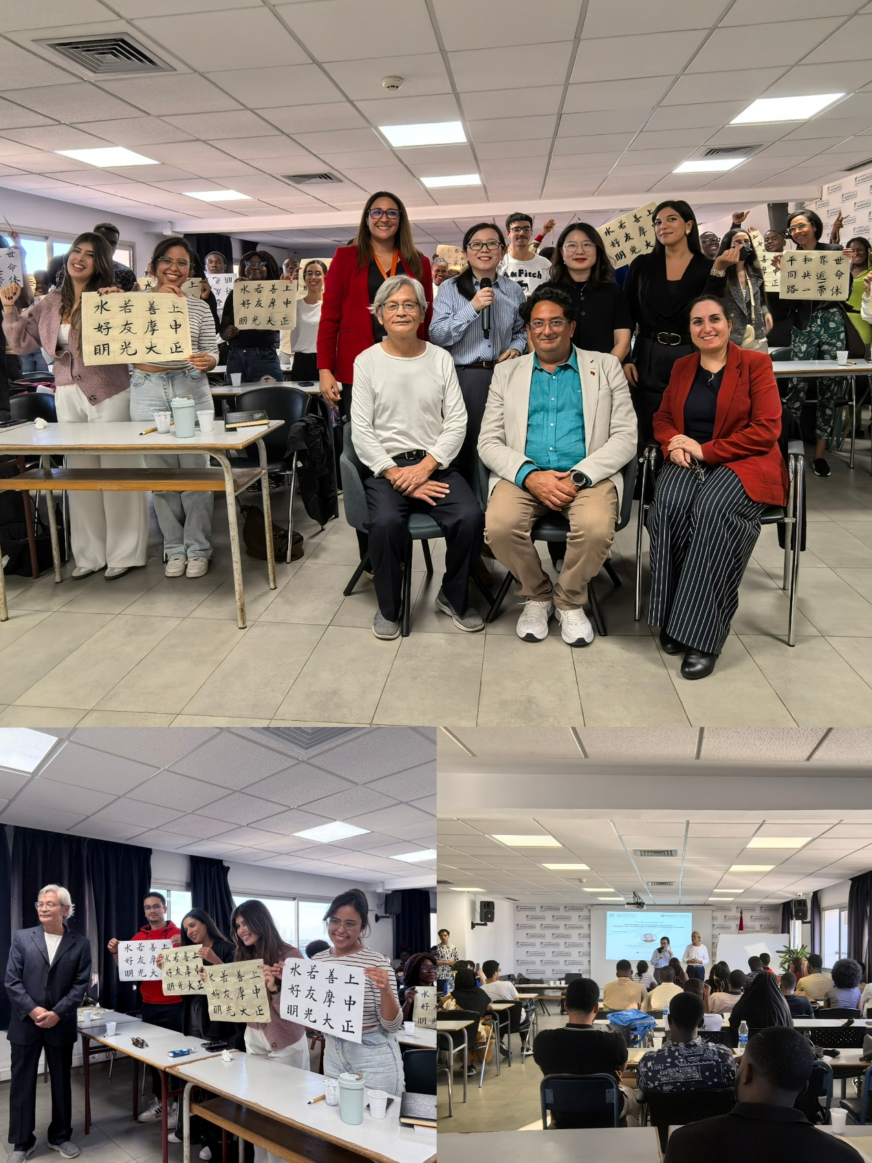 【摩洛哥,卡萨布兰卡】当地时间10月22日摩洛哥义乌商学院的校园里,一场主题为“墨香传情——体验中国传统书法文化”的交流活动拉开帷幕。此次活动特邀国内知名书法教育家、我校国际学生第二课堂书法教师南峰先生,为师生们带来了一场书法文化的盛宴。南老师到访期间,受到了合作院校巴尔卡维校长、穆查拉布副校长,法学院阿里教授的热情接待。在该校两个校区相继举行的两场活动中,吸引了合作院校蒙迪亚波利斯大学数百名师生热情参与,现场气氛活跃,墨香四溢,中国传统文化魅力引起了广泛的共鸣。