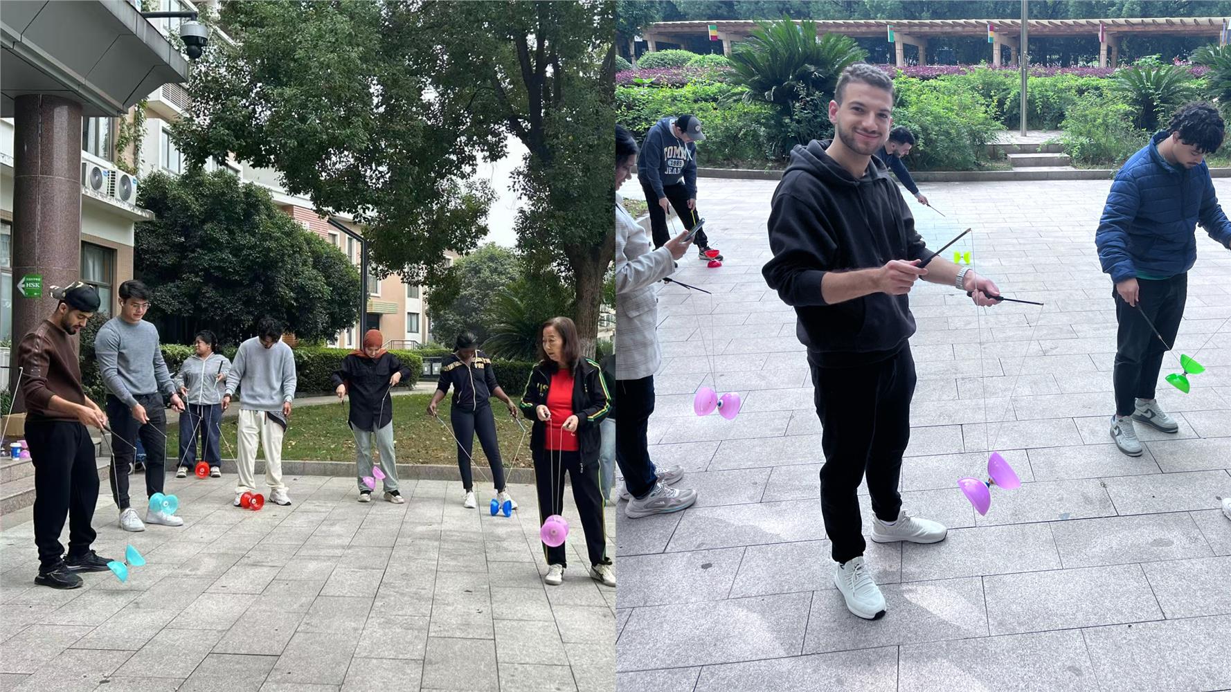 在空竹课上,空竹非遗传承人向国际学生介绍了空竹的由来,并展示了空竹的技艺,现场赢得了国际学生们的惊叹。课堂上充满了欢声笑语,国际学生们在空竹老师的指导下,积极体验空竹的基础玩法,感受这些来自于民间非遗技艺的独特魅力。