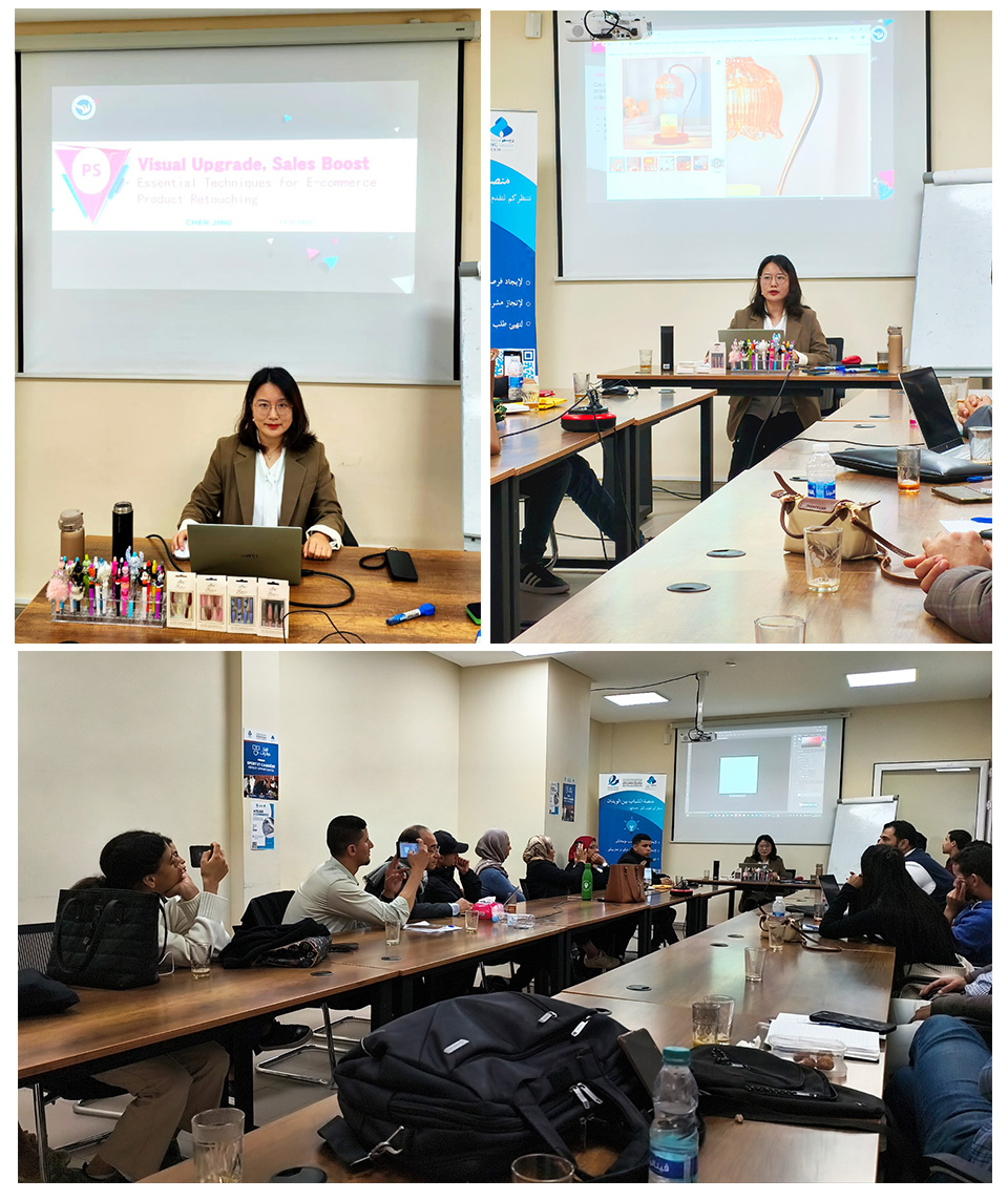 第二场讲座由陈静老师主讲,主题为“Visual Upgrade, Sales Boost——Essential Techniques for E-commerce Product Retouching”(视觉升级,销售提升——电商产品修图必备技巧)。陈老师首先强调了视觉呈现在电子商务中的重要性,并用丰富的案例和图像展示了优质图片如何吸引消费者并提高产品转化率。接着,她详细讲解了电商产品修图的核心技巧,并结合实例图片,指导学员如何提升产品的市场吸引力。讲座的最后部分是实际操作演示,陈老师分析了产品图像修复的常见问题,并现场展示了使用Photoshop进行图像修复的步骤与技巧。学员们积极参与讨论,对陈老师的实用技能表示高度赞赏。