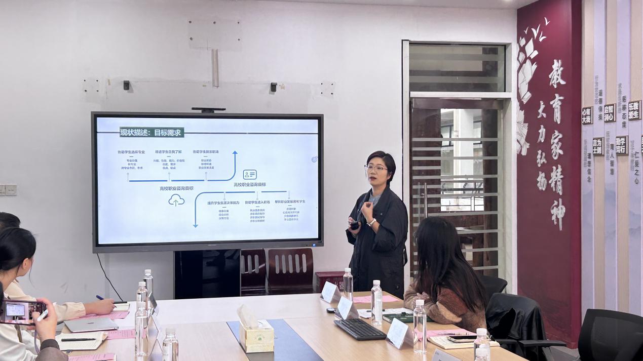 “七彩人生”职业发展工作室骨干成员陈超超老师围绕工作室源起与概况、工作室运营与发展、工作室成效与收获、工作室体会与感悟、工作室改革与创新等维度进行了汇报,重点介绍展示了工作室富有特色的“七彩体系”,并与大家分享了工作室建设中的三个着力点:一是自上而下推进和自下而上探索相结合;二是个体成长目标与组织发展目标相统一;三是自身职业发展与学生成长需求相契合。