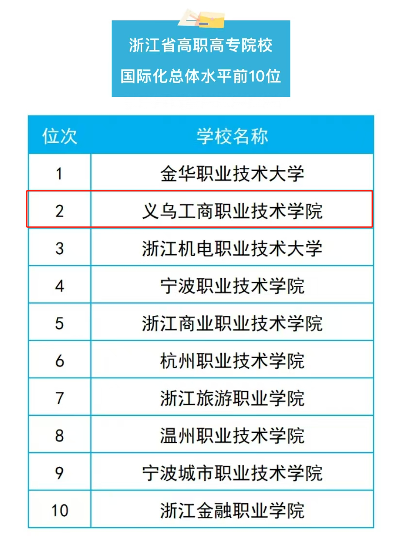 近日,浙江大学高等教育研究所正式发布《浙江省高等教育国际化年报(2023)》,学校国际化办学成绩优异,再次荣获浙江省高职高专院校国际化总体水平第二名,这标志着学校国际化水平不断提升,国际化建设成效显著。