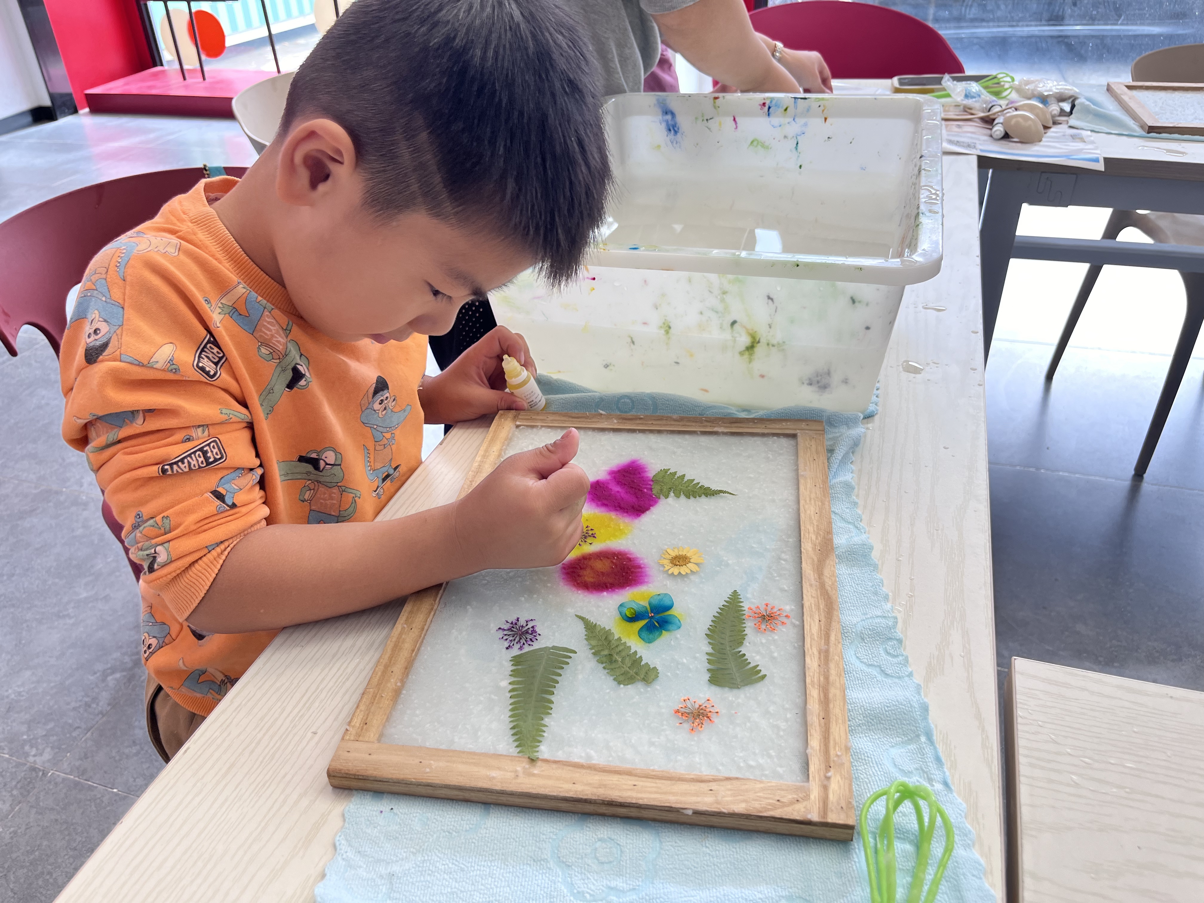 活动现场小朋友专心致志体验手工造纸