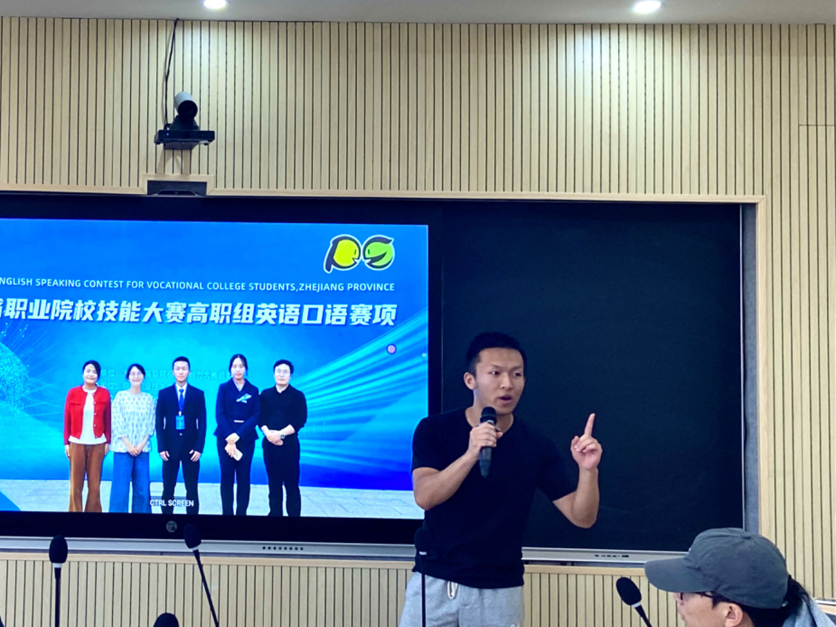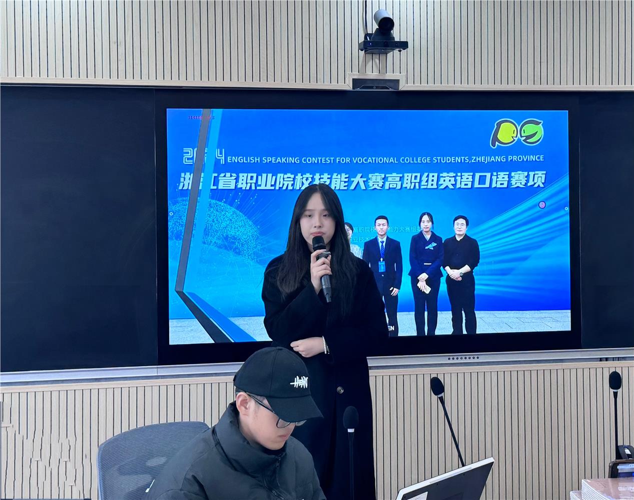 讲座中,Jhony还对一年一度的口语赛事进行了基本介绍,包括赛事的目的、流程和评判标准。讲座邀请了三位曾参加浙江省高职院校英语口语大赛的优秀选手,李正饶、汪逸阳和施培莹分享了他们的学习经验和参赛历程。三位同学在台上侃侃而谈,语言流利、表达地道。他们的口语水平和台上表现让在座的学生感到由衷地佩服,现场不时爆发出热烈的掌声。