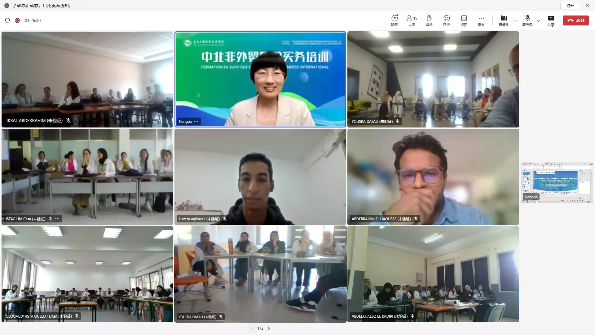 近日,外语外贸学院圆满完成中北非外贸跟单实务培训。此次培训旨在提升摩洛哥当地教师与学生外贸跟单操作专业技能。培训采用线上授课模式,由外语外贸学院负责授课,参训方组织学员现场参加。