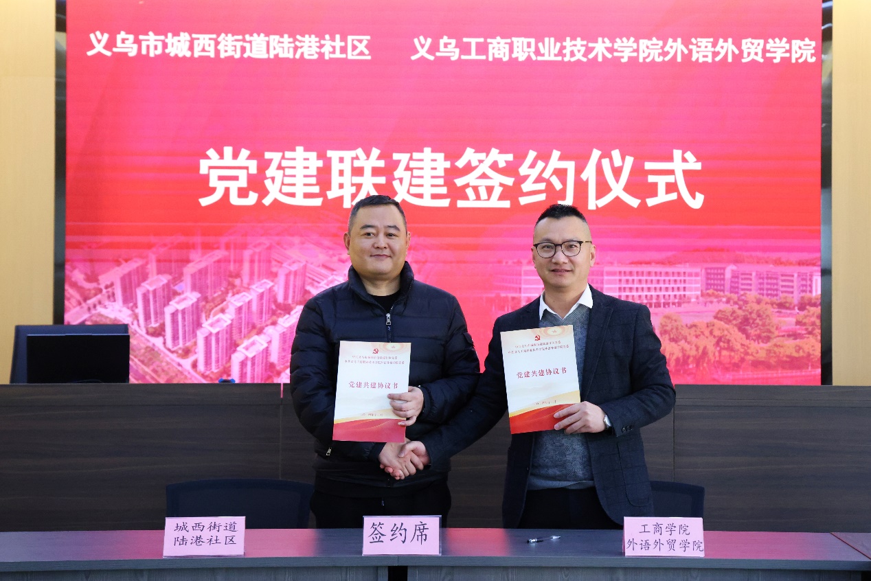近日,中共义乌工商职业技术学院外语外贸学院党委与中共义乌市城西街道陆港社区党委党建联建签约仪式在陆港社区隆重举行。义乌市城西街道党工委书记何家驹、党工委委员王瑾,陆港社区党委书记吴小飞,我校外语外贸学院党政负责人、校企合作处负责人及我校外语外贸学院相关老师等参加此次活动。