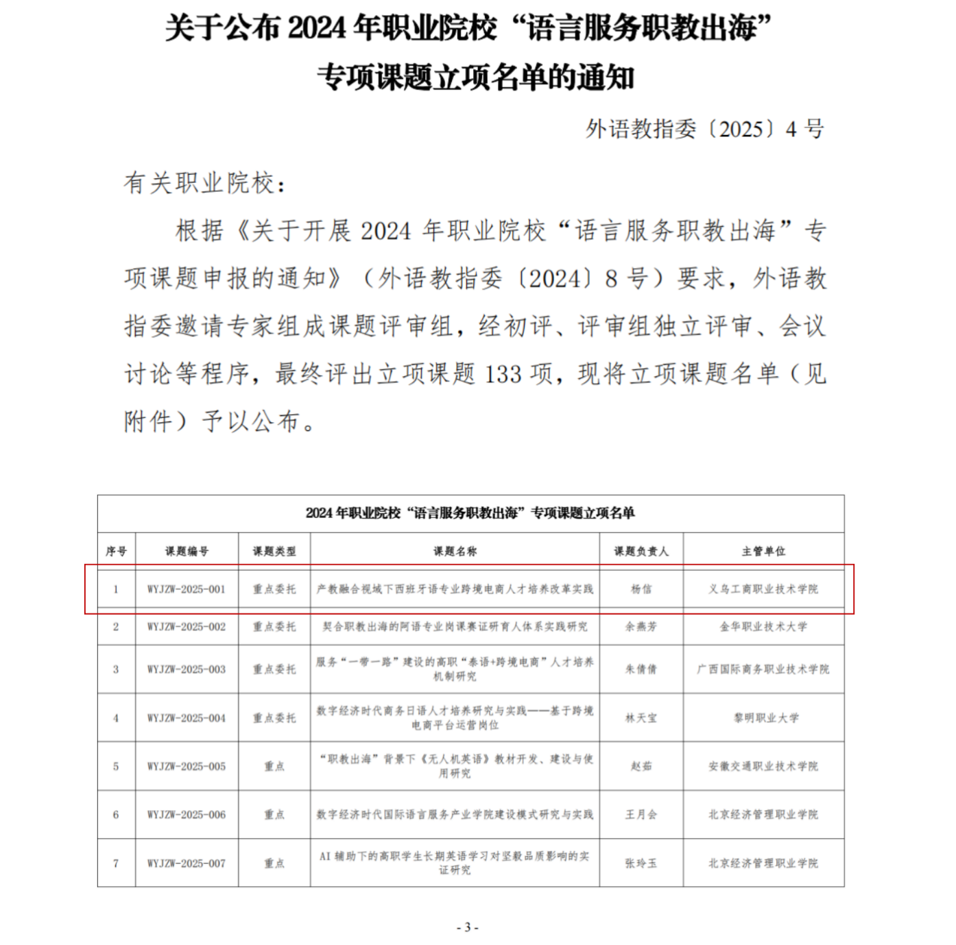 近日,教育部职业院校外语类专业教学指导委员会(以下简称“外语教指委”)公布了2024年职业院校“语言服务职教出海”专项课题立项名单。由我校外语外贸学院杨信教授主持申报的《产教融合视域下西班牙语专业跨境电商人才培养改革实践》成功入选重点委托课题。该课题立足区域经济发展和产业转型升级需求,聚焦“外语+跨境电商”交叉复合型人才培养模式创新,是我校服务国家“一带一路”倡议、推动数字贸易人才培养的阶段性成果。