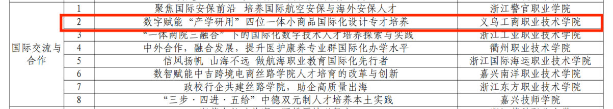近日,《浙江省职业教育蓝皮书(2024)》公布典型案例入选名单,全省共 64项案例脱颖而出。其中,创意设计学院的《数字赋能“产学研用”四位一体小商品国际化设计专才培养》案例,作为学校唯一入选项目,成功跻身“国际交流与合作”板块,成为全省职业教育国际化办学的亮眼成果。