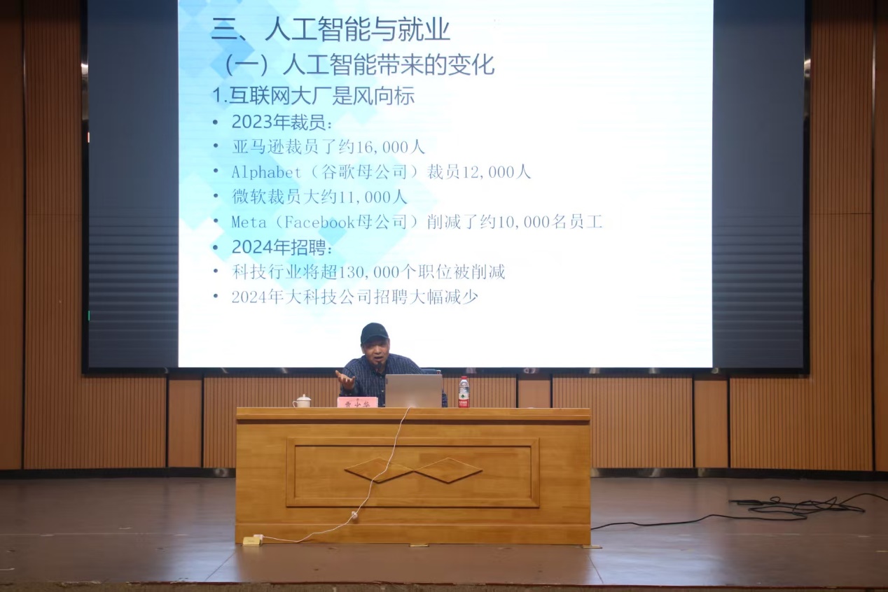 为引导大学生紧跟数智时代趋势,增强大学生就业创业竞争力,4月15日晚,外语外贸学院邀请到学校原党委副书记、副院长贾少华教授作题为《人工智能时代就业新形态创业新机遇》的讲座,为学生解密人工智能对就业创业的影响和其背后的逻辑和奥秘。
