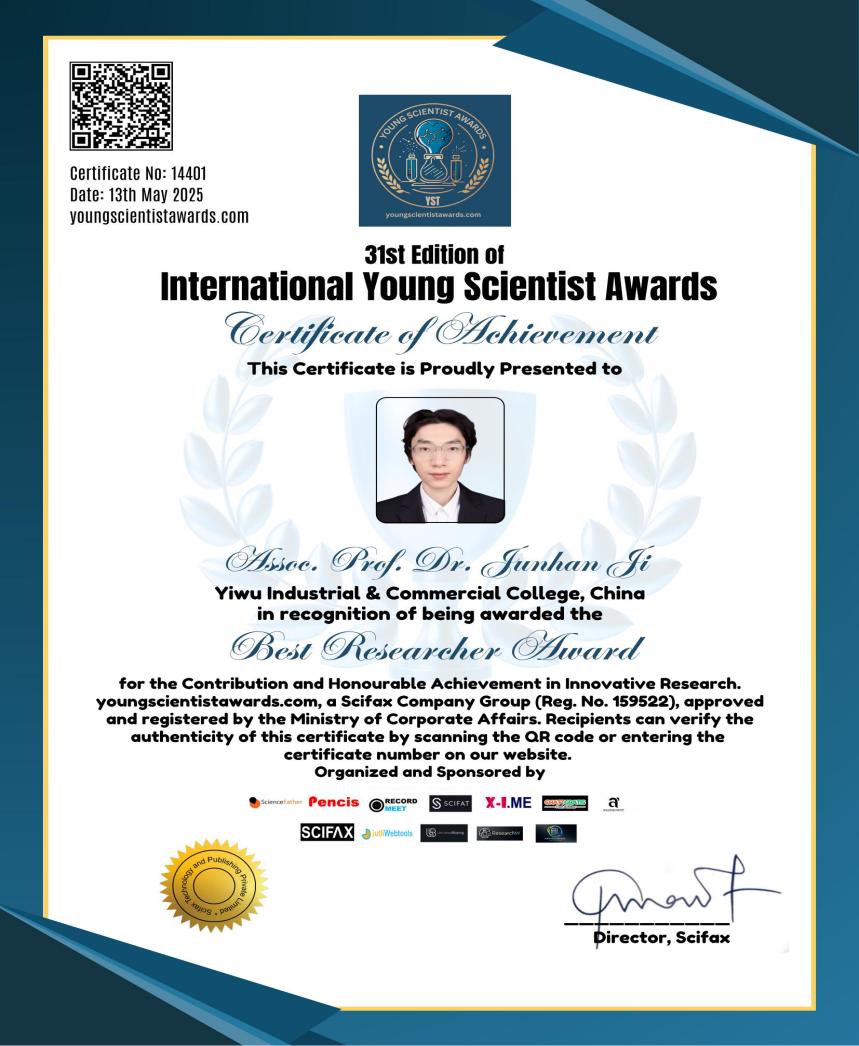 近日,义乌工商职业技术学院人文旅游学院社会工作科研团队积极参与由国际学术组织Science Father主办的第31届国际学术交流活动(31st Edition of International Academic Exchange Program)。团队教师季俊含博士在大会上作学术报告,并获得“最佳研究者奖(Best Researcher Award)”以表彰其在社会工作领域的研究成果与国际学术对话中的积极贡献。