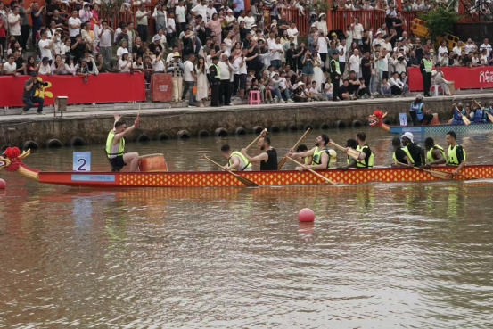 “咚咚咚,咚咚咚……”大陈江上战鼓齐擂,吼声震天。33支中外龙舟队一同破浪“狂飙”、势不可挡,我校学生选手们紧随鼓点,手中船桨快速翻飞。两岸超过8万名观众尖叫不断,热闹非凡。我校国际学生的“感知中国”龙舟队伍在比赛中顽强拼搏、配合默契,用行动诠释了“友谊第一,比赛第二”,展现了文化交流的生动写照。来自索马里的学生巴瑞表示:“今天的比赛振奋人心。训练时我们反复磨合,此刻在江上与各国队伍同场竞技,既紧张又自豪,仿佛真正融入了中国的端午文化!”