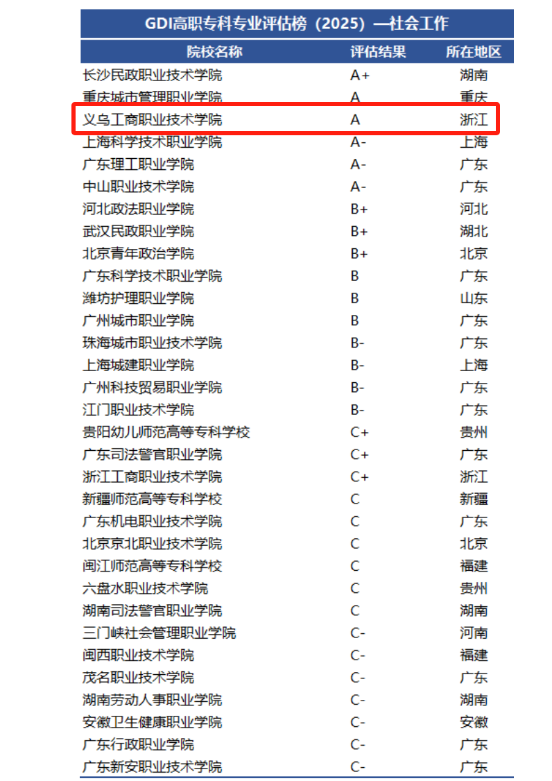 2025年6月12日,广州日报数字化研究院(GDI智库)正式发布“GDI高职专科专业评估榜(2025)”,我校社会工作专业位列全国第三名,获评A级。